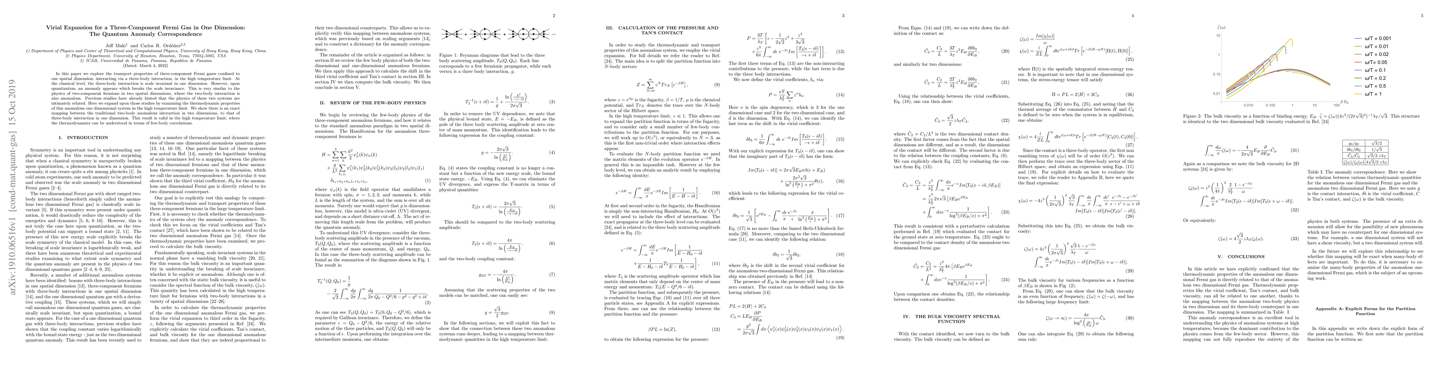 This paper investigates the transport and thermodynamic properties of a three-component Fermi gas in one dimension with a three-body interaction, revealing a quantum anomaly that breaks scale invariance upon quantization. It establishes an exact correspondence between the anomalous two-body interaction in two dimensions and the three-body interaction in one dimension in the high temperature limit.