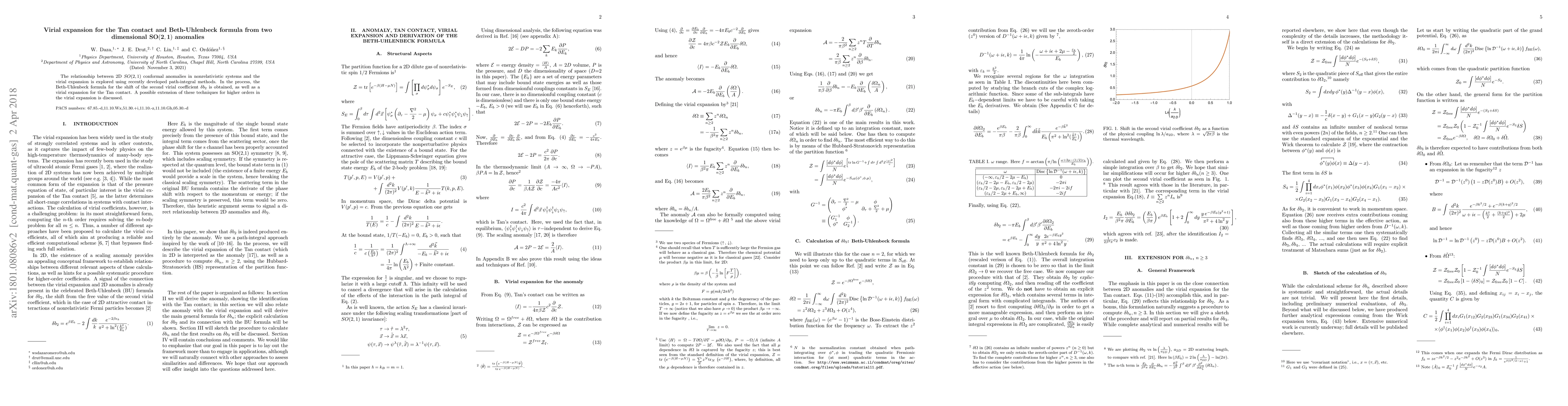 Researchers used path-integral methods to explore the connection between 2D conformal anomalies in non-relativistic systems and virial expansions, obtaining formulas for the Beth-Uhlenbeck shift of the second virial coefficient and a virial expansion for the Tan contact.