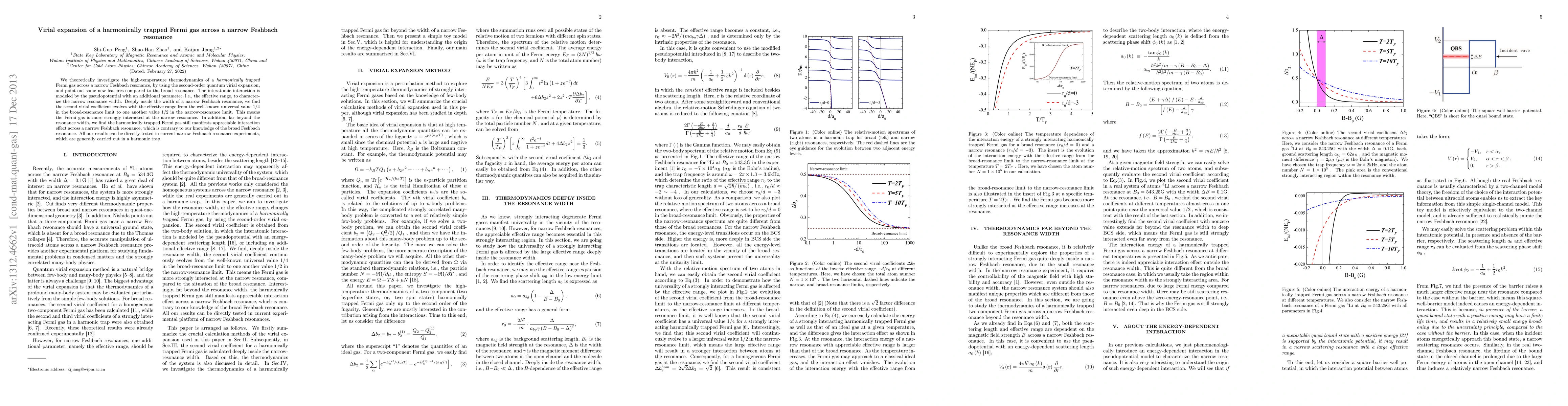 We theoretically investigate the high-temperature thermodynamics of a harmonically trapped Fermi gas across a narrow Feshbach resonance, by using the second-order quantum virial expansion, and point out some new features compared to the broad resonance. The interatomic interaction is modeled by the pseudopotential with an additional parameter, i.e., the effective range, to characterize the narrow resonance width. Deeply inside the width of a narrow Feshbach resonance, we find the second virial coefficient evolves with the effective range from the well-known universal value 1/4 in the broad-resonance limit to one another value 1/2 in the narrow-resonance limit. This means the Fermi gas is more strongly interacted at the narrow resonance. In addition, far beyond the resonance width, we find the harmonically trapped Fermi gas still manifests appreciable interaction effect across a narrow Feshbach resonance, which is contrary to our knowledge of the broad Feshbach resonance. All our results can be directly tested in current narrow Feshbach resonance experiments, which are generally carried out in a harmonic trap.