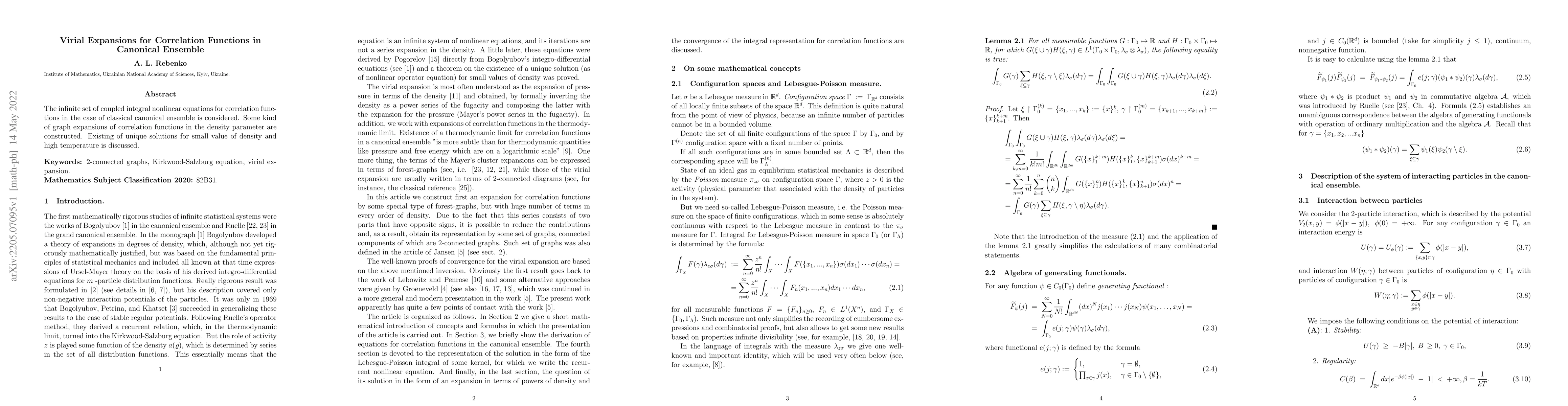 Researchers developed graph expansions for correlation functions in classical canonical ensemble, finding unique solutions at low density and high temperature.