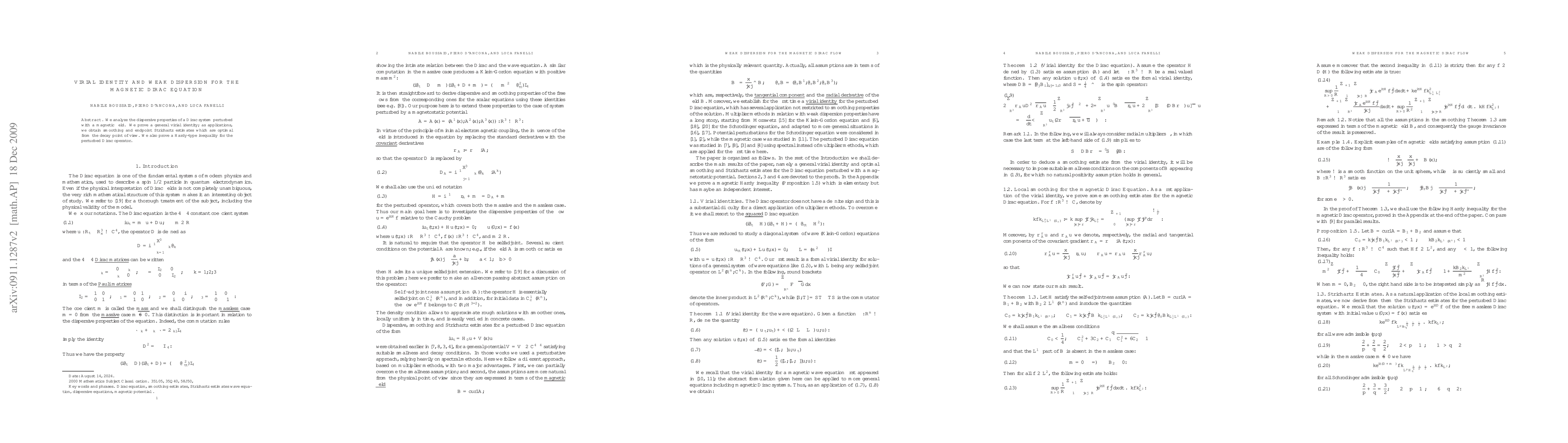 The paper establishes a virial identity for a Dirac system with magnetic field, leading to optimal smoothing and endpoint Strichartz estimates. It also proves a Hardy-type inequality for the perturbed Dirac operator, demonstrating weak dispersion properties.