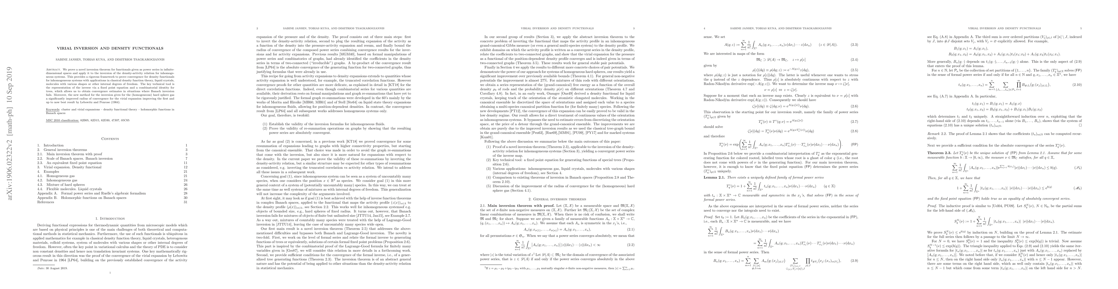 This paper establishes a novel inversion theorem for functionals in infinite-dimensional spaces, applying it to the density-activity relation for inhomogeneous systems. The method provides a rigorous framework for proving convergence of density functionals, with notable improvements in the convergence radius for the virial expansion of the hard sphere gas.