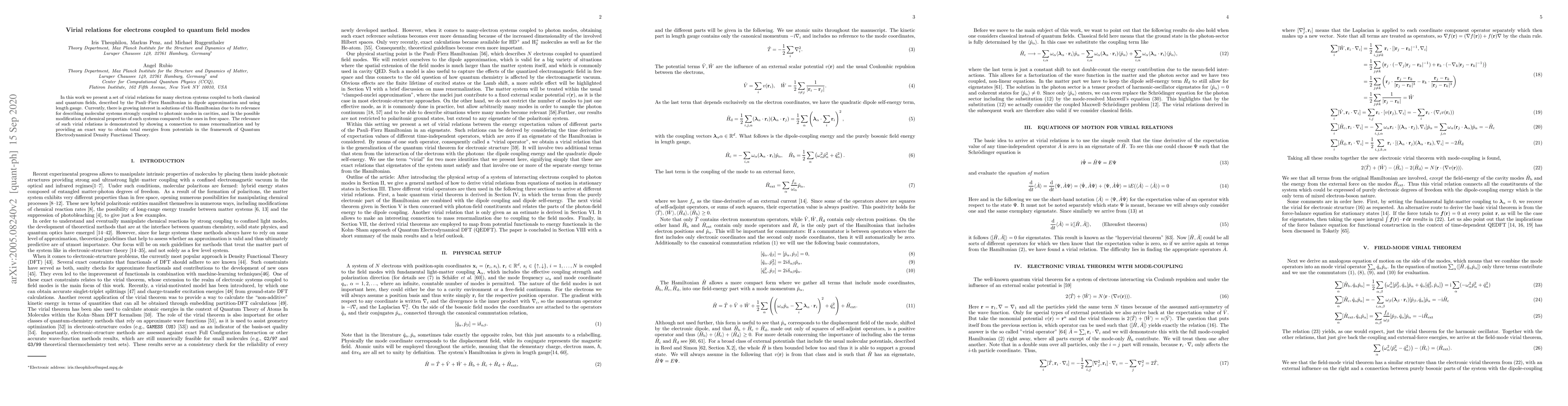 This paper develops virial relations for electron systems interacting with quantum field modes, relevant for describing molecular systems in photonic cavities. It connects these relations to mass renormalization and provides a method for calculating total energies within Quantum Electrodynamical Density Functional Theory.