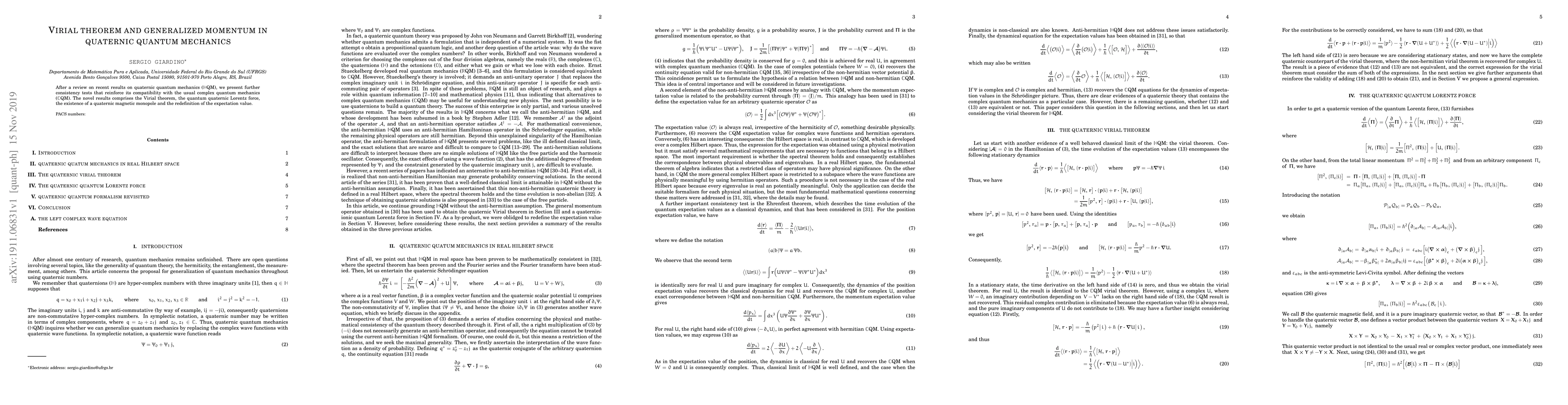 This paper tests quaternic quantum mechanics against complex quantum mechanics with new findings on the Virial theorem, Lorentz force, magnetic monopole, and expectation value, reinforcing its compatibility.