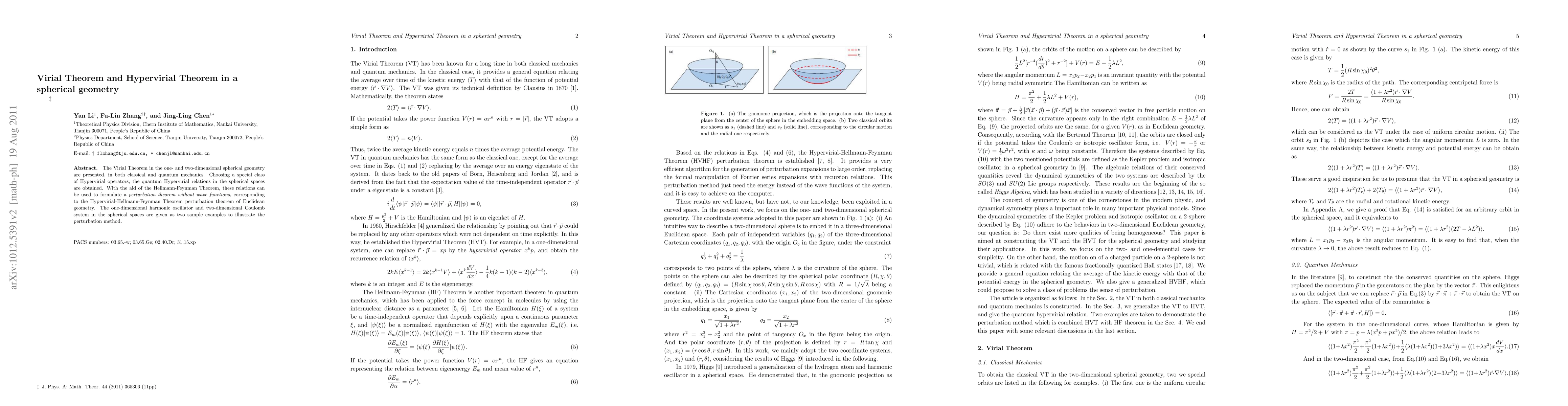 The Virial Theorem in the one- and two-dimensional spherical geometry are presented, in both classical and quantum mechanics. Choosing a special class of Hypervirial operators, the quantum Hypervirial relations in the spherical spaces are obtained. With the aid of the Hellmann-Feynman Theorem, these relations can be used to formulate a \emph{perturbation theorem without wave functions}, corresponding to the Hypervirial-Hellmann-Feynman Theorem perturbation theorem of Euclidean geometry. The one-dimensional harmonic oscillator and two-dimensional Coulomb system in the spherical spaces are given as two sample examples to illustrate the perturbation method.