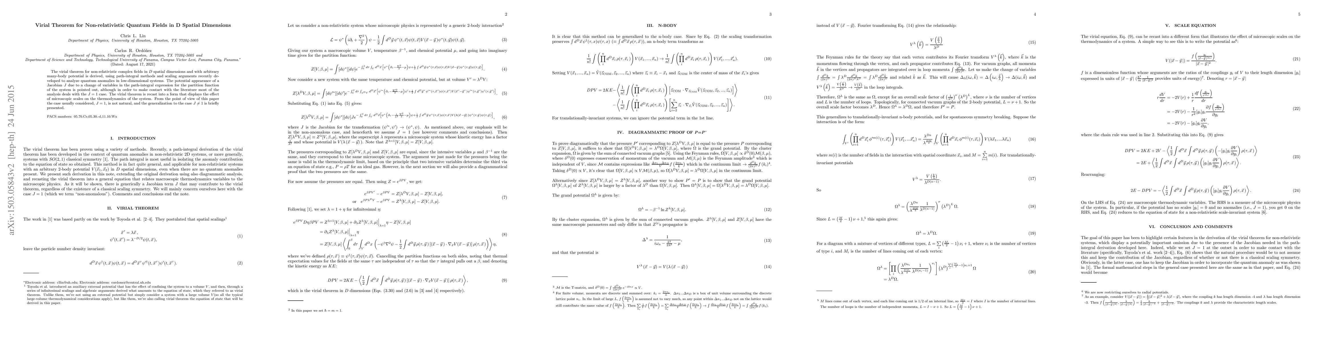 The virial theorem for non-relativistic complex fields in $D$ spatial dimensions and with arbitrary many-body potential is derived, using path-integral methods and scaling arguments recently developed to analyze quantum anomalies in low-dimensional systems. The potential appearance of a Jacobian $J$ due to a change of variables in the path-integral expression for the partition function of the system is pointed out, although in order to make contact with the literature most of the analysis deals with the $J=1$ case. The virial theorem is recast into a form that displays the effect of microscopic scales on the thermodynamics of the system. From the point of view of this paper the case usually considered, $J=1$, is not natural, and the generalization to the case $J\neq 1$ is briefly presented.