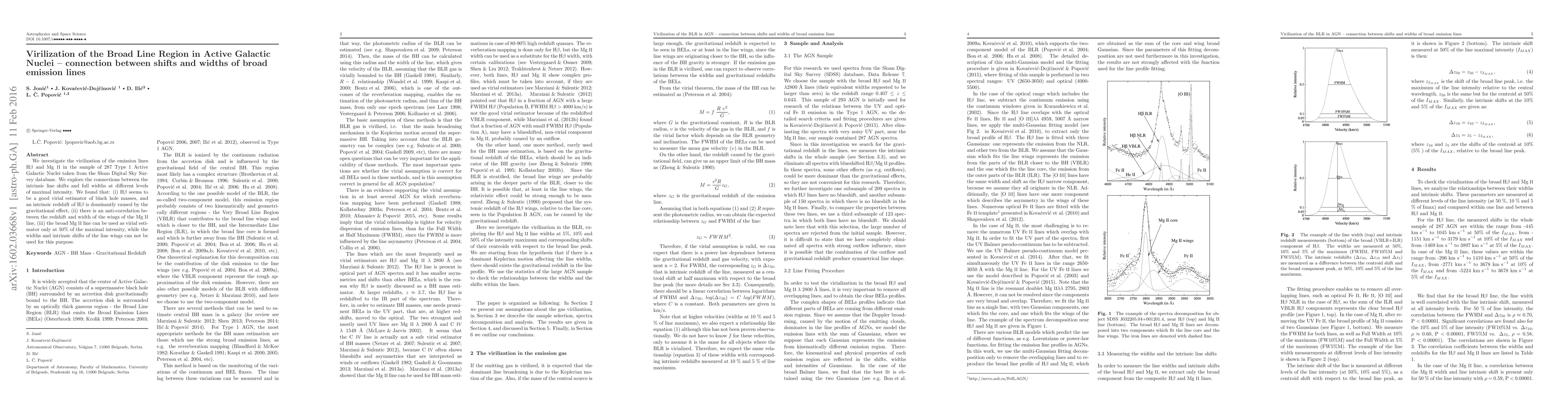 We investigate the virilization of the emission lines Hbeta and Mg II in the sample of 287 Type 1 Active Galactic Nuclei taken from the Sloan Digital Sky Survey database. We explore the connections between the intrinsic line shifts and full widths at different levels of maximal intensity. We found that: (i) Hbeta seems to be a good virial estimator of black hole masses, and an intrinsic redshift of Hbeta is dominantly caused by the gravitational effect, (ii) there is an anti-correlation between the redshift and width of the wings of the Mg II line, (iii) the broad Mg II line can be used as virial estimator only at 50% of the maximal intensity, while the widths and intrinsic shifts of the line wings can not be used for this purpose.
