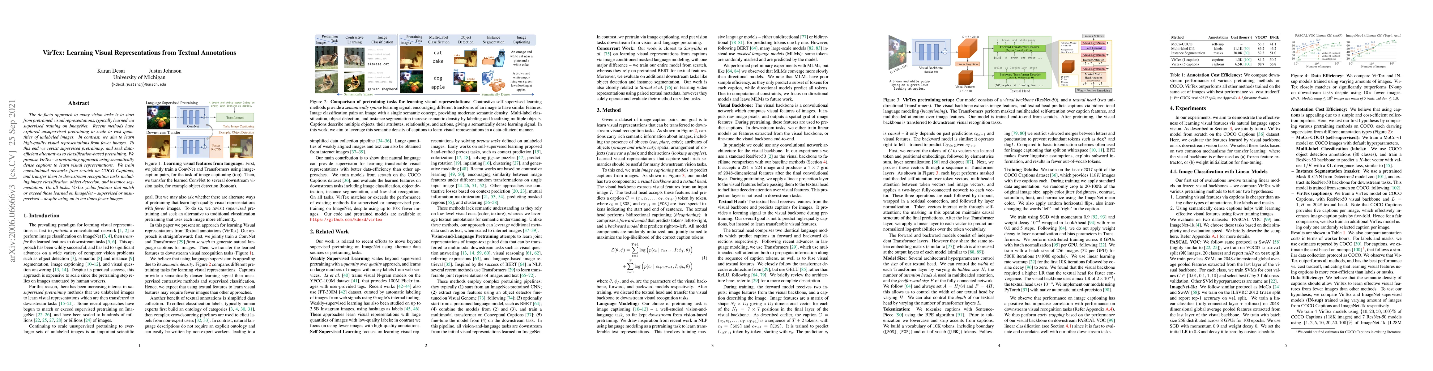 VirTex proposes a novel pretraining method using semantically dense captions to learn visual representations from fewer images, achieving performance comparable to ImageNet-trained models on tasks like image classification, object detection, and instance segmentation. This approach demonstrates data-efficient alternatives to traditional classification-based pretraining.