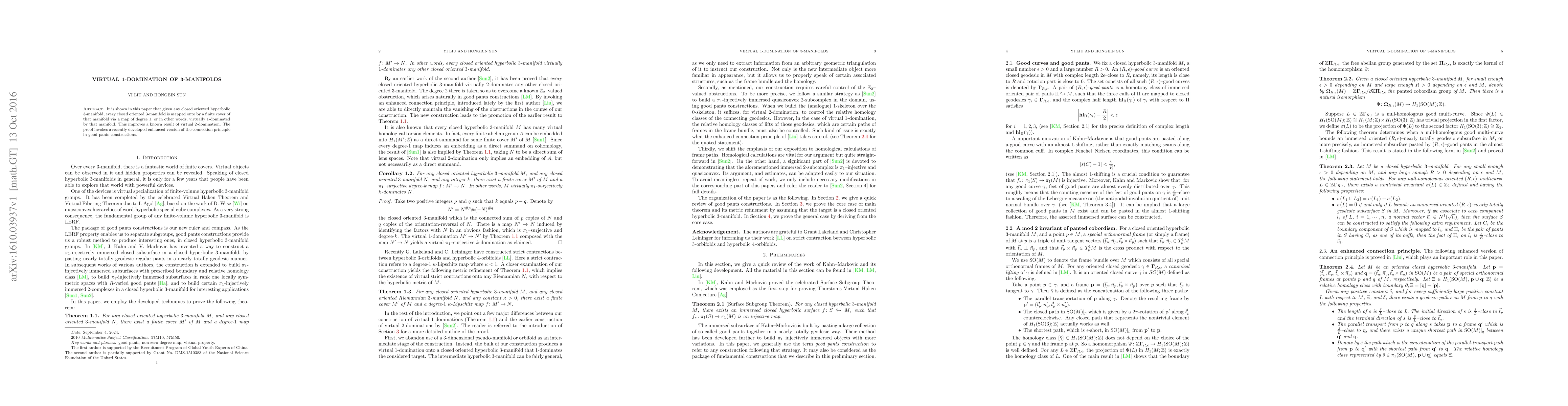 It is shown in this paper that given any closed oriented hyperbolic 3-manifold, every closed oriented 3-manifold is mapped onto by a finite cover of that manifold via a map of degree 1, or in other words, virtually 1-dominated by that manifold. This improves a known result of virtual 2-domination. The proof invokes a recently developed enhanced version of the connection principle in good pants constructions.