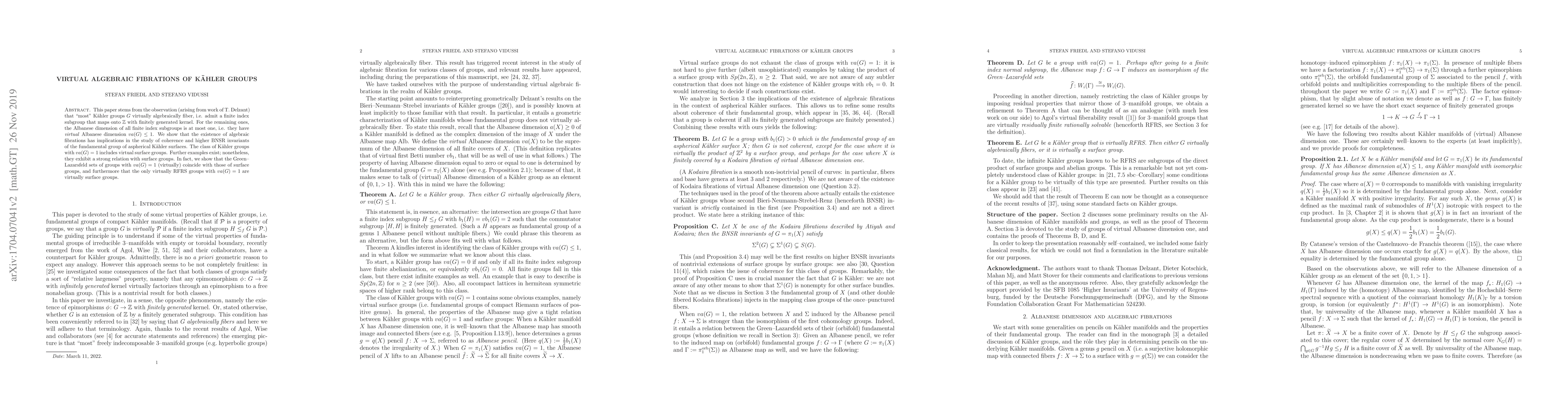 This paper explores the virtual algebraic fibrations of Kähler groups, demonstrating that most Kähler groups have a finite index subgroup that maps onto $\Bbb{Z}$ with a finitely generated kernel. It also establishes that Kähler groups with virtual Albanese dimension $\leq 1$ relate strongly to surface groups, showing a coincidence of Green--Lazarsfeld sets and that groups with $va(G) = 1$ are virtually surface groups.