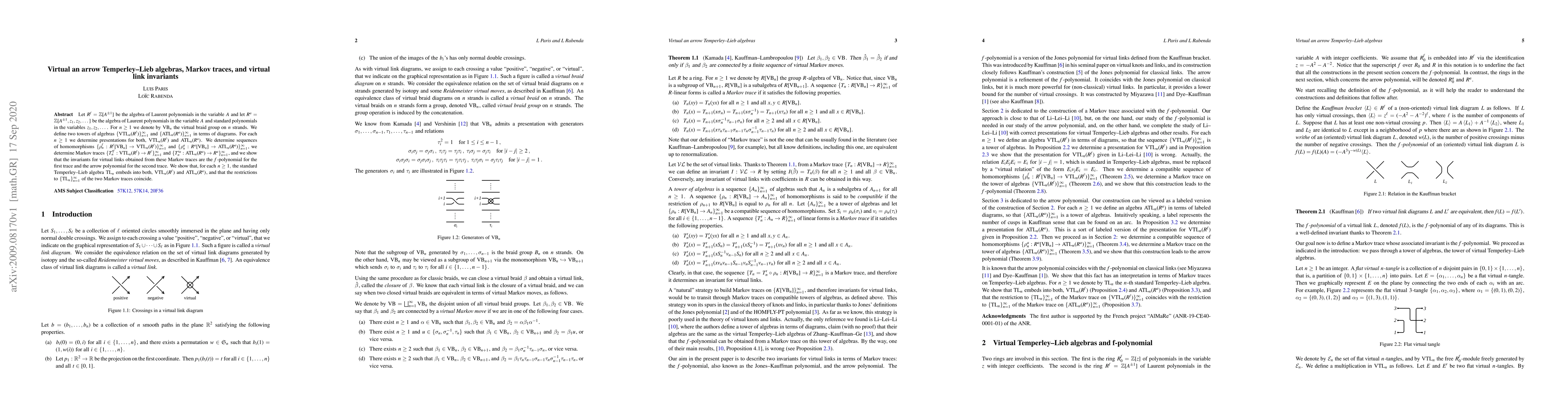Let R f = Z[A $\pm$1 ] be the algebra of Laurent polynomials in the variable A and let R a = Z[A $\pm$1 , z 1 , z 2 ,. .. ] be the algebra of Laurent polynomials in the variable A and standard polynomials in the variables z 1 , z 2 ,. .. . For n $\ge$ 1 we denote by VB n the virtual braid group on n strands. We define two towers of algebras {VTL n (R f)} $\infty$ n=1 and {ATL n (R a)} $\infty$ n=1 in terms of diagrams. For each n $\ge$ 1 we determine presentations for both, VTL n (R f) and ATL n (R a). We determine sequences of homomorphisms {$\rho$ f n : R f [VB n ] $\rightarrow$ VTL n (R f)} $\infty$ n=1 and {$\rho$ a n : R a [VB n ] $\rightarrow$ ATL n (R a)} $\infty$ n=1 , we determine Markov traces {T f n : VTL n (R f) $\rightarrow$ R f } $\infty$ n=1 and {T a n : ATL n (R a) $\rightarrow$ R a } $\infty$ n=1 , and we show that the invariants for virtual links obtained from these Markov traces are the f-polynomial for the first trace and the arrow polynomial for the second trace. We show that, for each n $\ge$ 1, the standard Temperley-Lieb algebra TL n embeds into both, VTL n (R f) and ATL n (R a), and that the restrictions to {TL n } $\infty$ n=1 of the two Markov traces coincide.