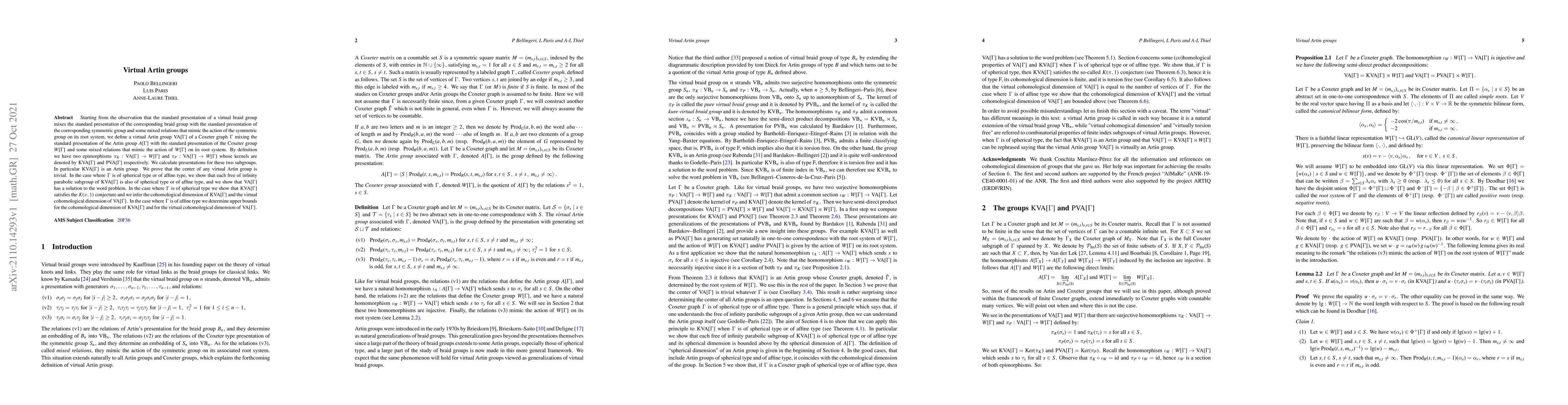 Starting from the observation that the standard presentation of a virtual braid group mixes the standard presentation of the corresponding braid group with the standard presentation of the corresponding symmetric group and some mixed relations that mimic the action of the symmetric group on its root system, we define a virtual Artin group $VA[\Gamma]$ of a Coxeter graph $\Gamma$ mixing the standard presentation of the Artin group $A[\Gamma]$ with the standard presentation of the Coxeter group $W[\Gamma]$ and some mixed relations that mimic the action of $W[\Gamma]$ on its root system. By definition we have two epimorphisms $\pi_K:VA[\Gamma]\to W[\Gamma]$ and $\pi_P:VA[\Gamma]\to W[\Gamma]$ whose kernels are denoted by $KVA[\Gamma]$ and $PVA[\Gamma]$ respectively. We calculate presentations for these two subgroups. In particular $KVA[\Gamma]$ is an Artin group. We prove that the center of any virtual Artin group is trivial. In the case where $\Gamma$ is of spherical type or of affine type, we show that each free of infinity parabolic subgroup of $KVA[\Gamma]$ is also of spherical type or of affine type, and we show that $VA[\Gamma]$ has a solution to the word problem. In the case where $\Gamma$ is of spherical type we show that $KVA[\Gamma]$ satisfies the $K(\pi,1)$ conjecture and we infer the cohomological dimension of $KVA[\Gamma]$ and the virtual cohomological dimension of $VA[\Gamma]$. In the case where $\Gamma$ is of affine type we determine upper bounds for the cohomological dimension of $KVA[\Gamma]$ and for the virtual cohomological dimension of $VA[\Gamma]$.