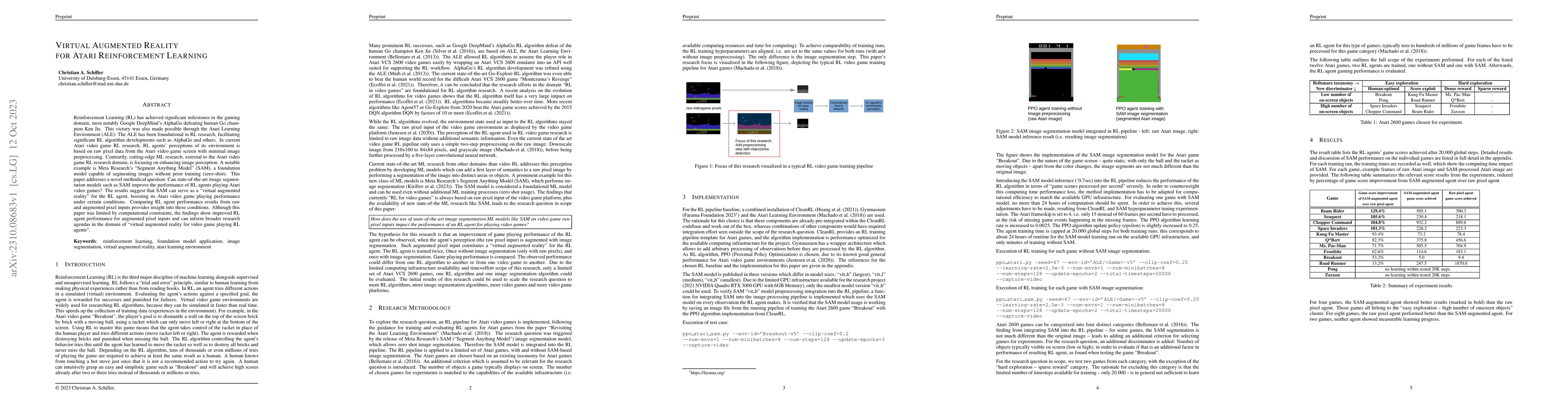 This paper investigates whether advanced image segmentation models like Meta Research's SAM can enhance the performance of RL agents in Atari games by providing "virtual augmented reality." Results indicate that SAM can improve RL agent performance under specific conditions when compared to raw pixel inputs.