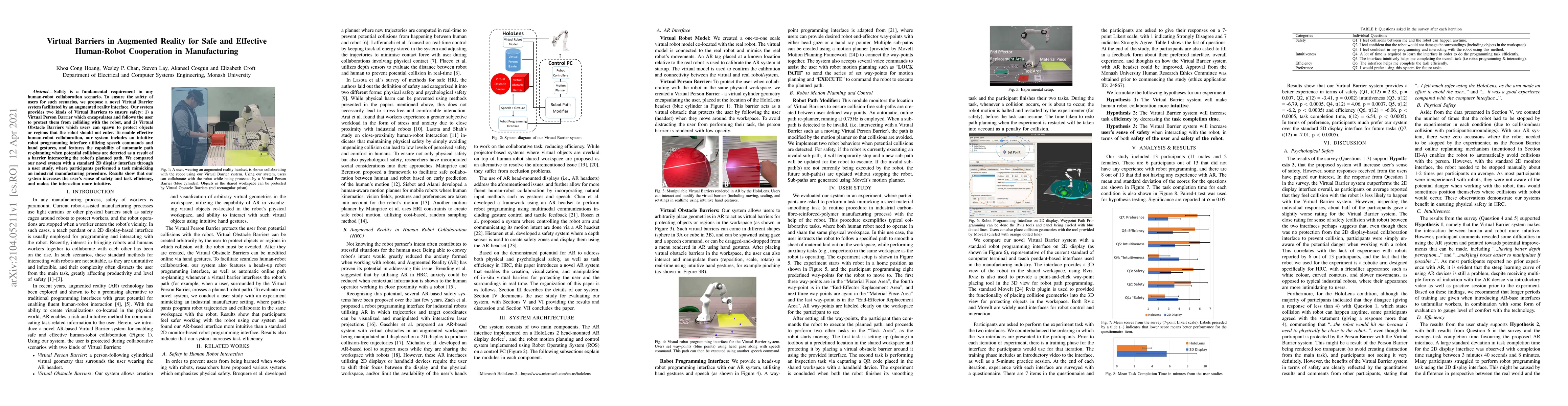 This paper proposes a Virtual Barrier system in augmented reality to enhance safety and efficiency in human-robot collaboration in manufacturing. The system includes Virtual Person and Obstacle Barriers, an intuitive programming interface, and automatic path re-planning, which were found to improve safety and task efficiency in a user study compared to a standard 2D display.