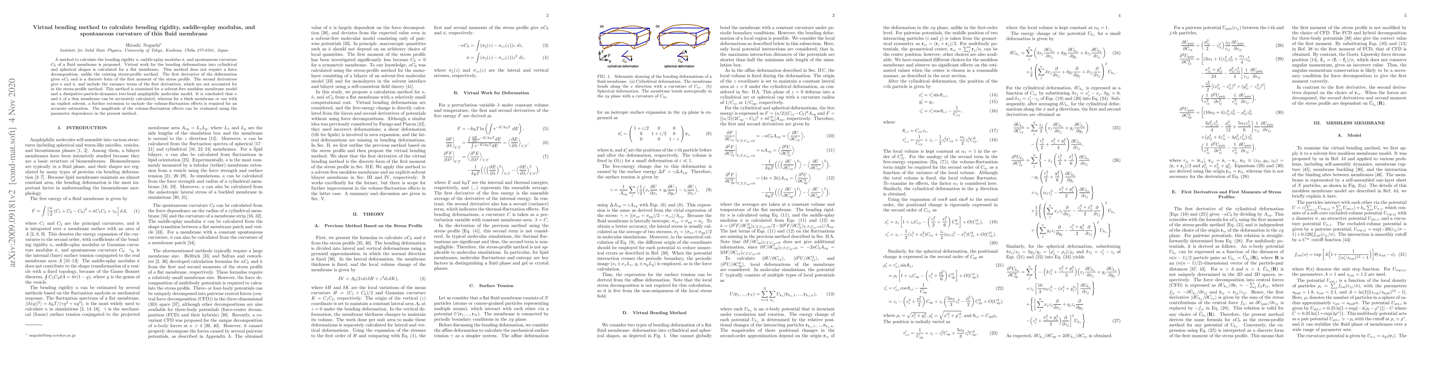 This paper proposes a virtual bending method to calculate the bending rigidity, saddle-splay modulus, and spontaneous curvature of fluid membranes without force decomposition. The method accurately estimates these parameters for thin membranes but requires further extension for thick membranes or those with explicit solvent.