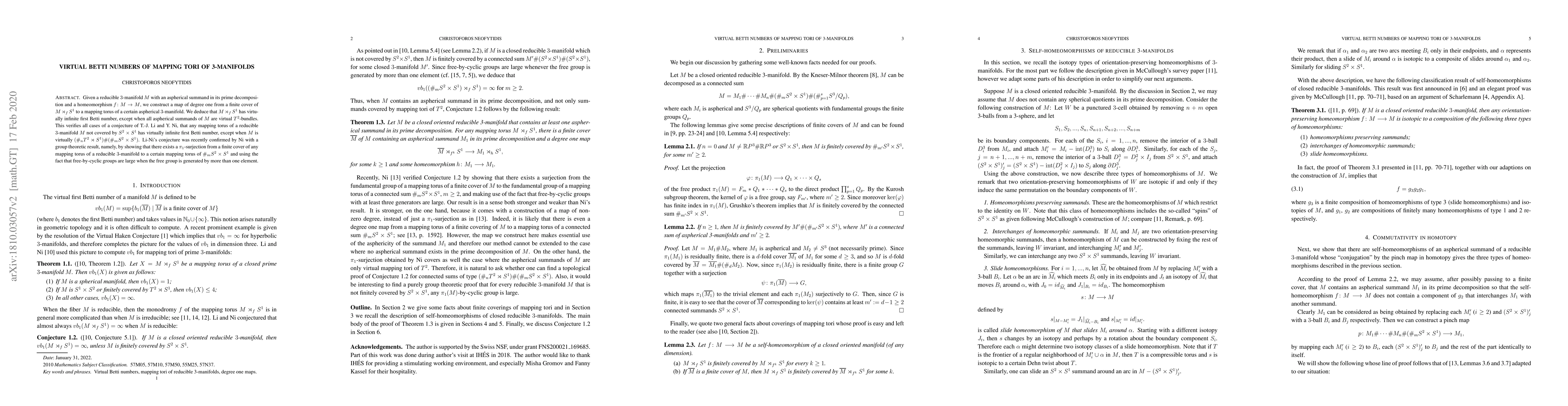 Given a reducible $3$-manifold $M$ with an aspherical summand in its prime decomposition and a homeomorphism $f\colon M\to M$, we construct a map of degree one from a finite cover of $M\rtimes_f S^1$ to a mapping torus of a certain aspherical $3$-manifold. We deduce that $M\rtimes_f S^1$ has virtually infinite first Betti number, except when all aspherical summands of $M$ are virtual $T^2$-bundles. This verifies all cases of a conjecture of T.-J. Li and Y. Ni, that any mapping torus of a reducible $3$-manifold $M$ not covered by $S^2\times S^1$ has virtually infinite first Betti number, except when $M$ is virtually $(\#_n T^2\rtimes S^1)\#(\#_mS^2\times S^1)$. Li-Ni's conjecture was recently confirmed by Ni with a group theoretic result, namely, by showing that there exists a $\pi_1$-surjection from a finite cover of any mapping torus of a reducible $3$-manifold to a certain mapping torus of $\#_m S^2\times S^1$ and using the fact that free-by-cyclic groups are large when the free group is generated by more than one element.