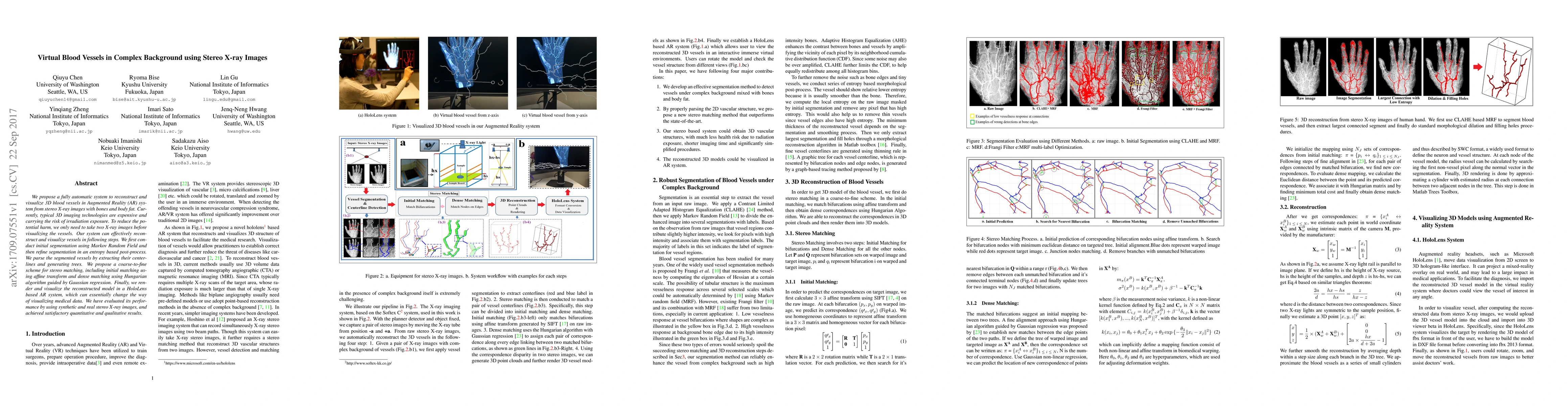 We propose a fully automatic system to reconstruct and visualize 3D blood vessels in Augmented Reality (AR) system from stereo X-ray images with bones and body fat. Currently, typical 3D imaging technologies are expensive and carrying the risk of irradiation exposure. To reduce the potential harm, we only need to take two X-ray images before visualizing the vessels. Our system can effectively reconstruct and visualize vessels in following steps. We first conduct initial segmentation using Markov Random Field and then refine segmentation in an entropy based post-process. We parse the segmented vessels by extracting their centerlines and generating trees. We propose a coarse-to-fine scheme for stereo matching, including initial matching using affine transform and dense matching using Hungarian algorithm guided by Gaussian regression. Finally, we render and visualize the reconstructed model in a HoloLens based AR system, which can essentially change the way of visualizing medical data. We have evaluated its performance by using synthetic and real stereo X-ray images, and achieved satisfactory quantitative and qualitative results.