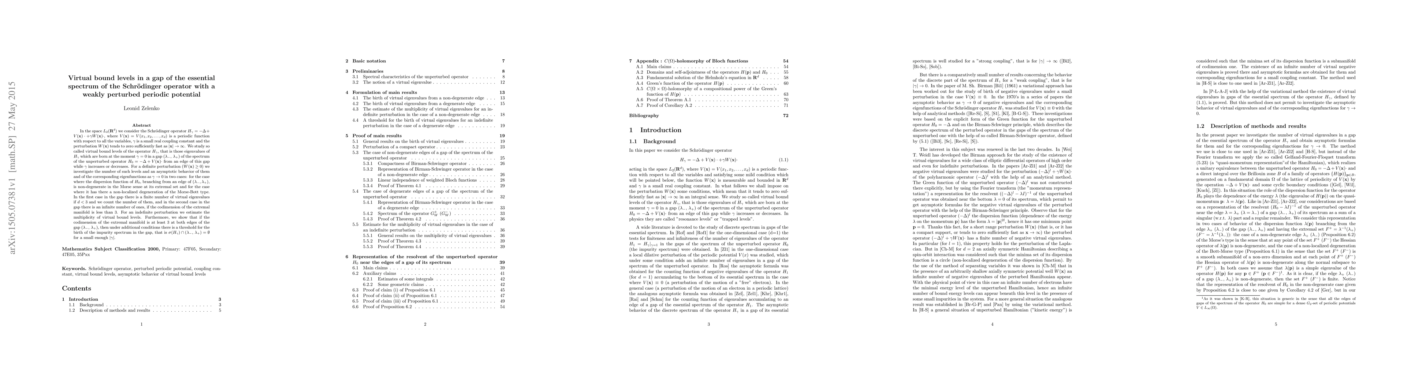 In the space $L_2(R^d)$ we consider the Schr\"odinger operator $H_\gamma=-\Delta+ V(x)\cdot+\gamma W(x)\cdot$, where $V(x)=V(x_1,x_2,\dots,x_d)$ is a periodic function with respect to all the variables, $\gamma$ is a small real coupling constant and the perturbation $W(x)$ tends to zero sufficiently fast as $|x|\rightarrow\infty$. We study so called virtual bound levels of the operator $H_\gamma$, that is those eigenvalues of $H_\gamma$ which are born at the moment $\gamma=0$ in a gap $(\lambda_-,\,\lambda_+)$ of the spectrum of the unperturbed operator $H_0=-\Delta+ V(x)\cdot$ from an edge of this gap while $\gamma$ increases or decreases. For a definite perturbation $(W(x)\ge 0)$ we investigate the number of such levels and an asymptotic behavior of them and of the corresponding eigenfunctions as $\gamma\rightarrow 0$ in two cases: for the case where the dispersion function of $H_0$, branching from an edge of $(\lambda_-,\lambda_+)$, is non-degenerate in the Morse sense at its extremal set and for the case where it has there a non-localized degeneration of the Morse-Bott type. In the first case in the gap there is a finite number of virtual eigenvalues if $d<3$ and we count the number of them, and in the second case in the gap there is an infinite number of ones, if the codimension of the extremal manifold is less than $3$. For an indefinite perturbation we estimate the multiplicity of virtual bound levels. Furthermore, we show that if the codimension of the extremal manifold is at least $3$ at both edges of the gap $(\lambda_-,\,\lambda_+)$, then under additional conditions there is a threshold for the birth of the impurity spectrum in the gap, that is $\sigma(H_\gamma)\cap(\lambda_-,\,\lambda_+)=\emptyset$ for a small enough |\gamma|.