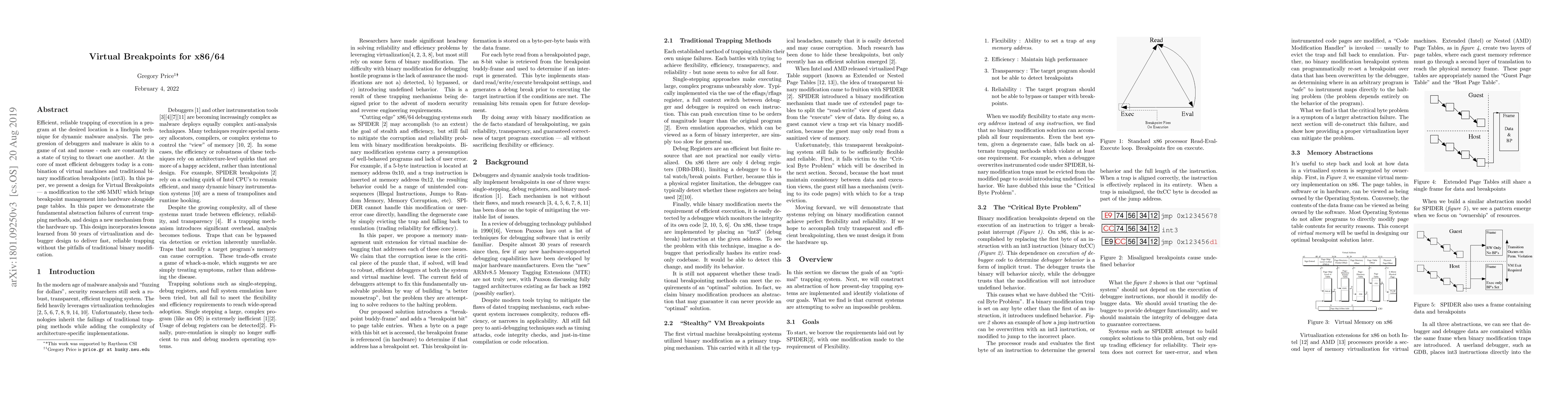This paper introduces Virtual Breakpoints, a hardware-based modification to the x86 MMU for efficient and reliable program execution trapping, addressing the limitations of traditional binary modification breakpoints. It aims to enhance dynamic malware analysis by leveraging lessons from virtualization and debugger design.