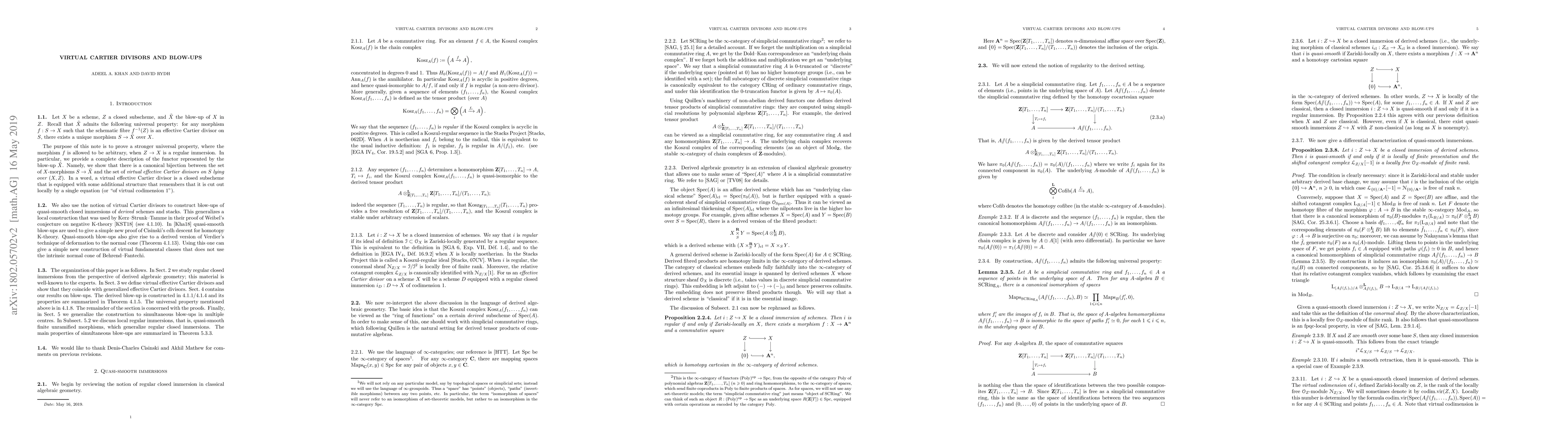 The paper introduces the concept of 'virtual effective Cartier divisor' and proves a universal property for blow-ups in regularly immersed subschemes using this notion. It also constructs blow-ups of quasi-smooth closed immersions in derived algebraic geometry.