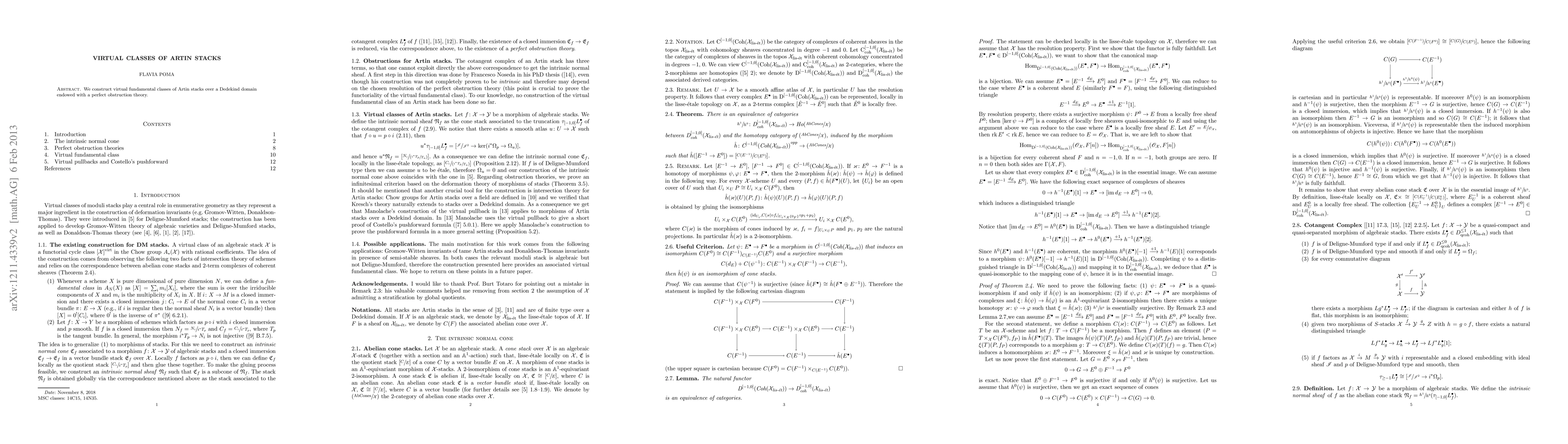 Summary: This paper constructs virtual fundamental classes for Artin stacks over Dedekind domains, utilizing a perfect obstruction theory to achieve this construction. The method provides a new tool for algebraic geometry.