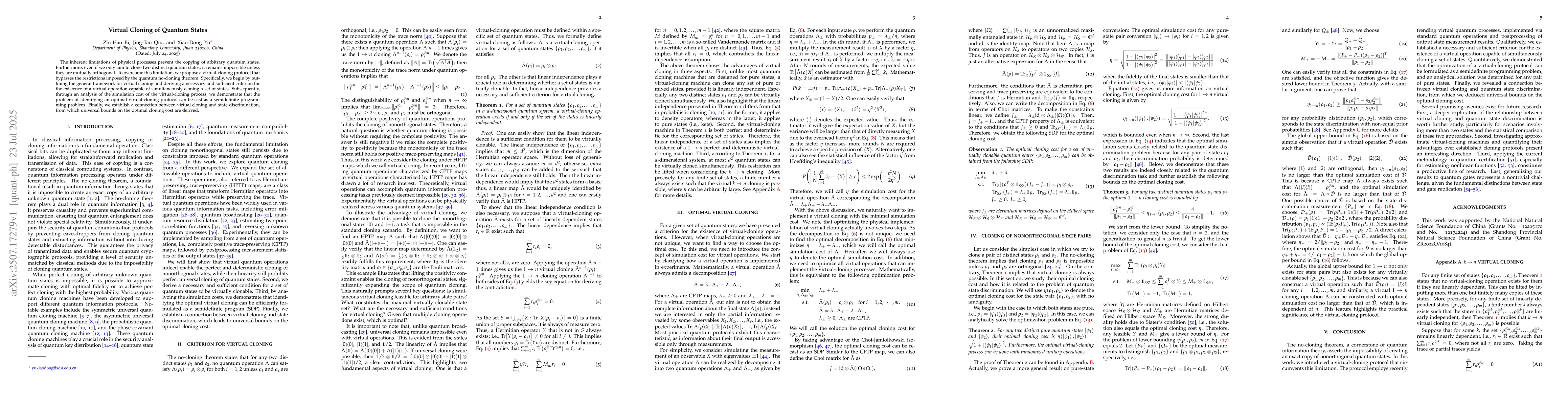 The inherent limitations of physical processes prevent the copying of arbitrary quantum states. Furthermore, even if we only aim to clone two distinct quantum states, it remains impossible unless they are mutually orthogonal. To overcome this limitation, we propose a virtual-cloning protocol that bypasses the restrictions imposed by the quantum no-cloning theorem. Specifically, we begin by outlining the general framework for virtual cloning and deriving a necessary and sufficient criterion for the existence of a virtual operation capable of simultaneously cloning a set of states. Subsequently, through an analysis of the simulation cost of the virtual-cloning process, we demonstrate that the problem of identifying an optimal virtual-cloning protocol can be cast as a semidefinite programming problem. Finally, we establish a connection between virtual cloning and state discrimination, from which universal bounds on the optimal cloning cost are derived.