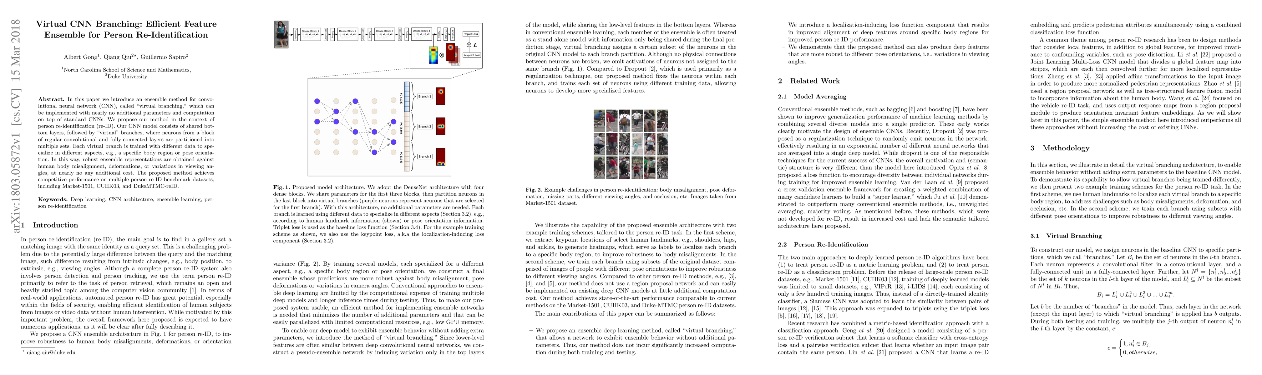 This paper introduces a virtual CNN branching method for person re-identification that achieves competitive performance with minimal additional parameters and computation, improving robustness against human body misalignment and variations.