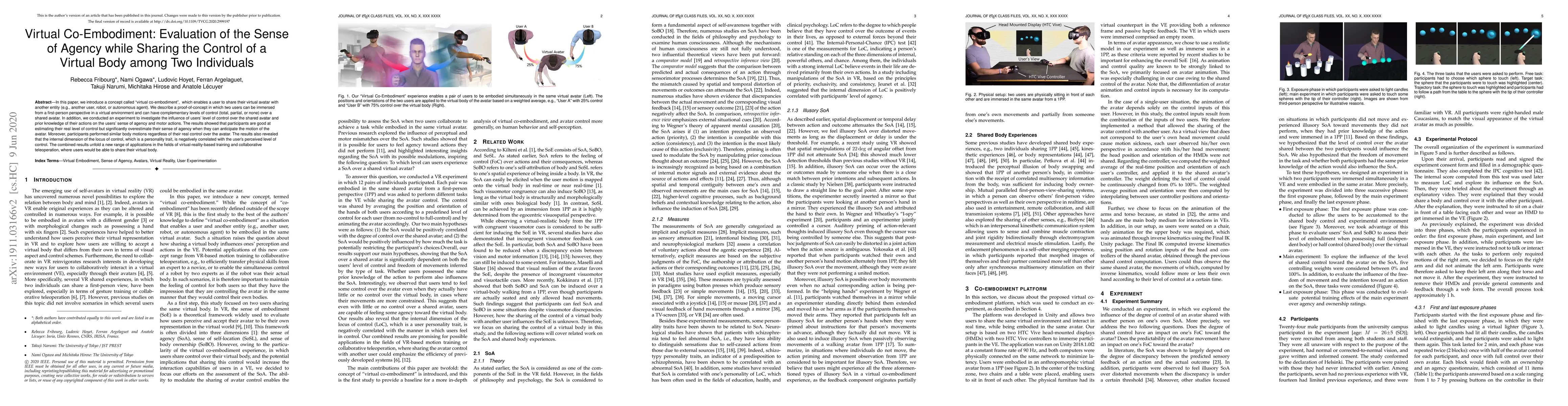 This paper explores "virtual co-embodiment," where two users share control over a virtual avatar, examining how control levels and anticipation affect the sense of agency. Results indicate participants overestimate agency when anticipating avatar movements, and internal locus of control correlates with perceived control.