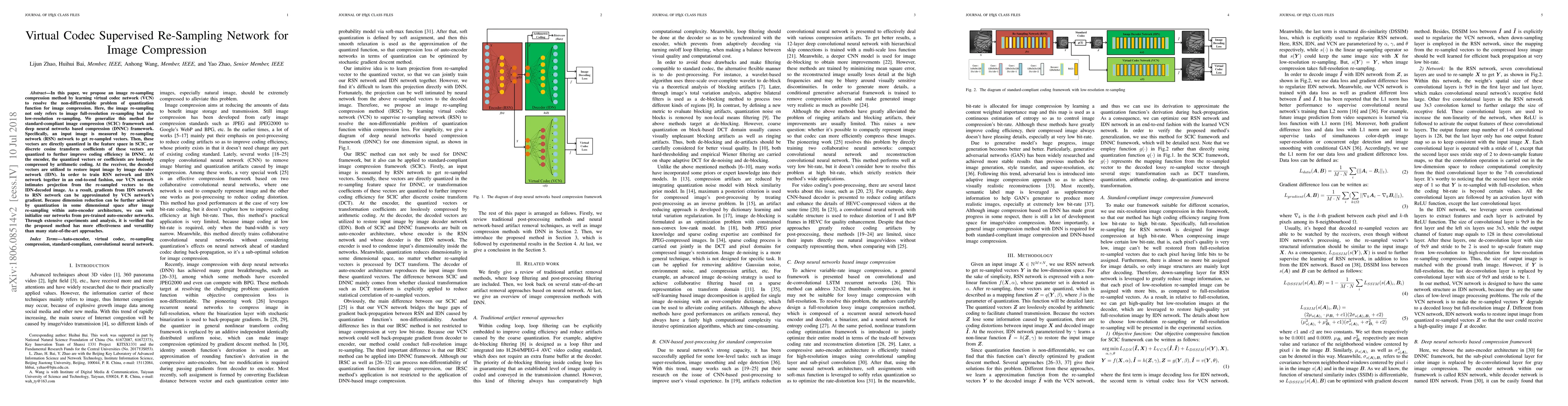 This paper proposes an image compression method using a Virtual Codec Network (VCN) that addresses the non-differentiable quantization problem. It employs a re-sampling network to transform images, followed by quantization in either feature space or DCT coefficients, and lossless compression via arithmetic coding. The method is shown to outperform state-of-the-art techniques in effectiveness and versatility.
