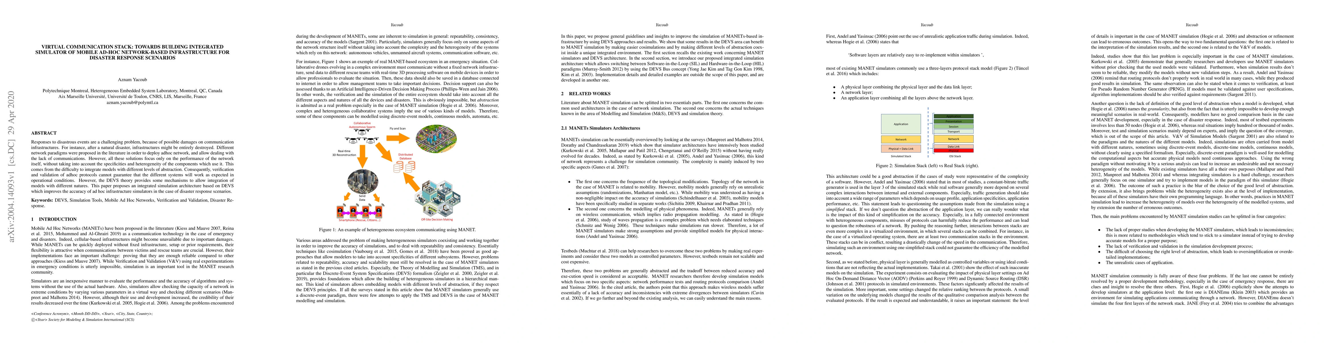 Responses to disastrous events are a challenging problem, because of possible damages on communication infrastructures. For instance, after a natural disaster, infrastructures might be entirely destroyed. Different network paradigms were proposed in the literature in order to deploy adhoc network, and allow dealing with the lack of communications. However, all these solutions focus only on the performance of the network itself, without taking into account the specificities and heterogeneity of the components which use it. This comes from the difficulty to integrate models with different levels of abstraction. Consequently, verification and validation of adhoc protocols cannot guarantee that the different systems will work as expected in operational conditions. However, the DEVS theory provides some mechanisms to allow integration of models with different natures. This paper proposes an integrated simulation architecture based on DEVS which improves the accuracy of ad hoc infrastructure simulators in the case of disaster response scenarios.