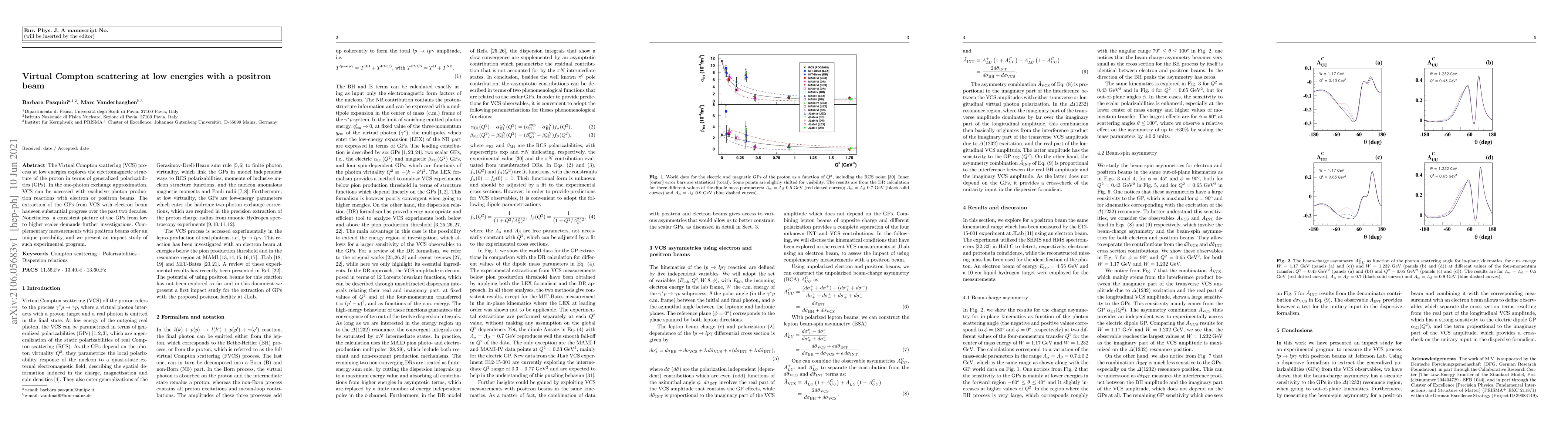 This paper investigates Virtual Compton scattering (VCS) at low energies using a positron beam to explore the electromagnetic structure of the proton via generalized polarizabilities. While significant progress has been made with electron beams, complementary measurements with positron beams are proposed to provide a more complete picture of these properties.