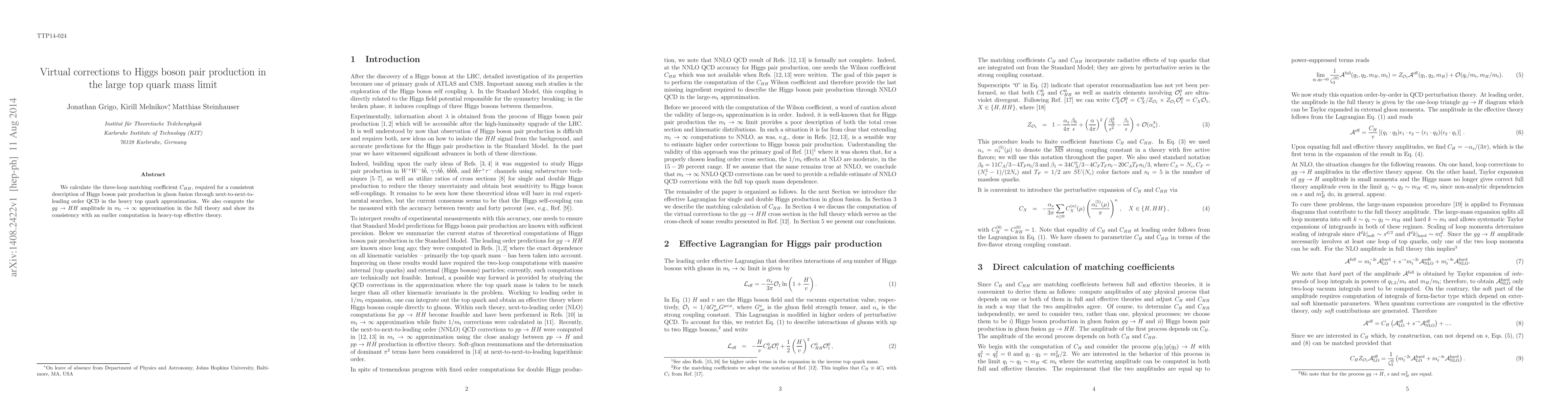 This paper calculates the three-loop matching coefficient $C_{HH}$ for Higgs boson pair production in gluon fusion, and verifies the consistency of the $gg \to HH$ amplitude in the large top quark mass limit with previous heavy-top effective theory computations.