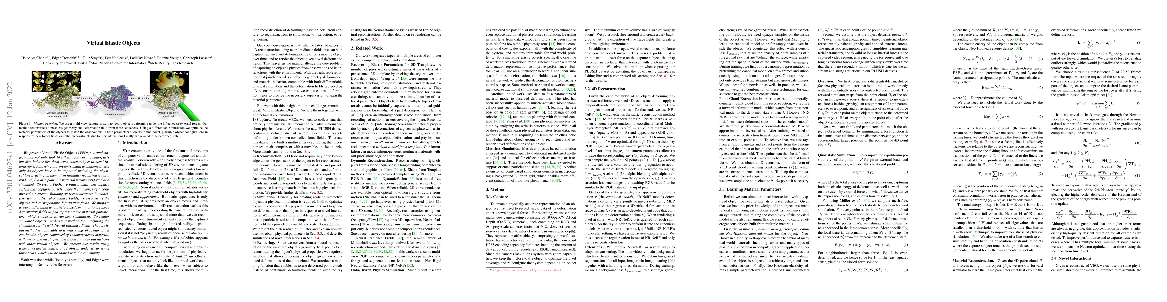 We present Virtual Elastic Objects (VEOs): virtual objects that not only look like their real-world counterparts but also behave like them, even when subject to novel interactions. Achieving this presents multiple challenges: not only do objects have to be captured including the physical forces acting on them, then faithfully reconstructed and rendered, but also plausible material parameters found and simulated. To create VEOs, we built a multi-view capture system that captures objects under the influence of a compressed air stream. Building on recent advances in model-free, dynamic Neural Radiance Fields, we reconstruct the objects and corresponding deformation fields. We propose to use a differentiable, particle-based simulator to use these deformation fields to find representative material parameters, which enable us to run new simulations. To render simulated objects, we devise a method for integrating the simulation results with Neural Radiance Fields. The resulting method is applicable to a wide range of scenarios: it can handle objects composed of inhomogeneous material, with very different shapes, and it can simulate interactions with other virtual objects. We present our results using a newly collected dataset of 12 objects under a variety of force fields, which will be shared with the community.