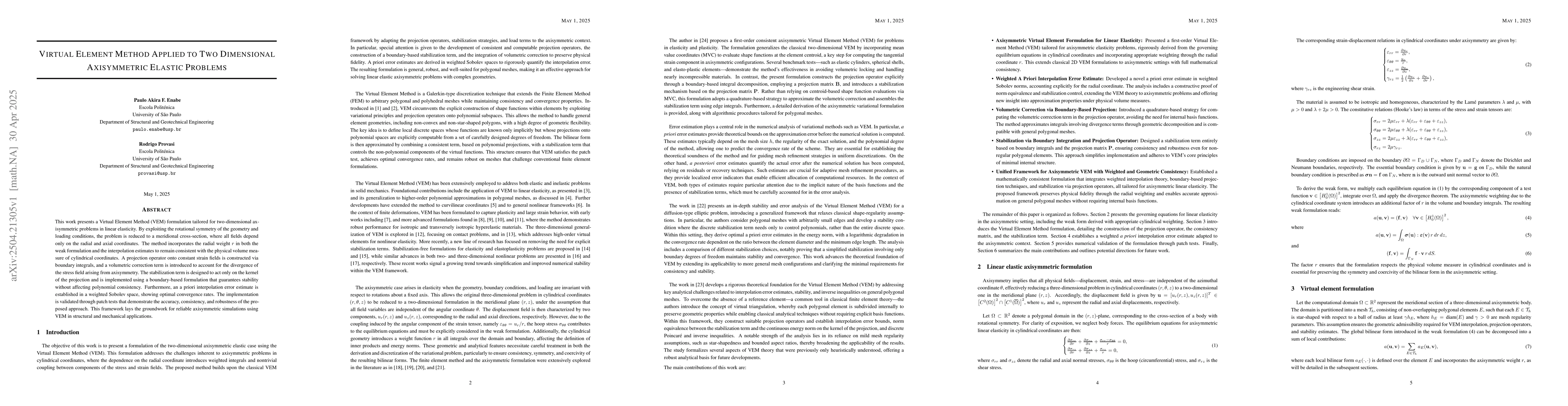 The paper's main technical contribution is the development of a VEM formulation specifically for two-dimensional axisymmetric elastic problems, including a projection operator, volumetric correction term, and stabilization strategy.
