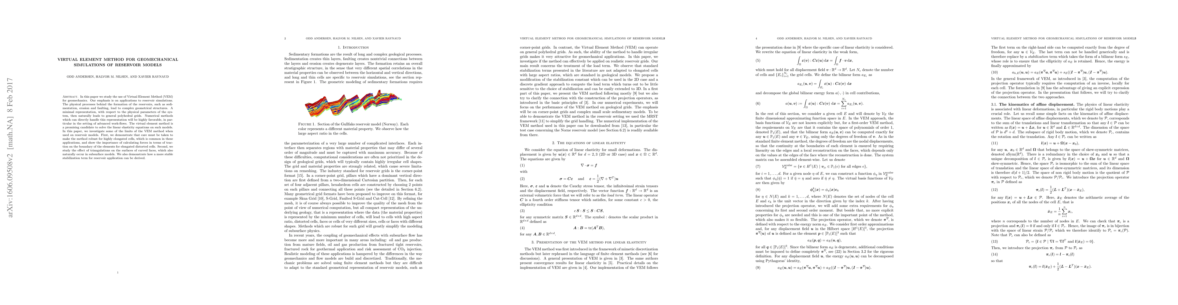 This paper explores the application of the Virtual Element Method (VEM) for solving linear elasticity in geomechanics, particularly for reservoir simulations. The study highlights the method's challenges with highly elongated cells and curved surfaces, proposing solutions like boundary traction calculations and improved regularization terms for stability.