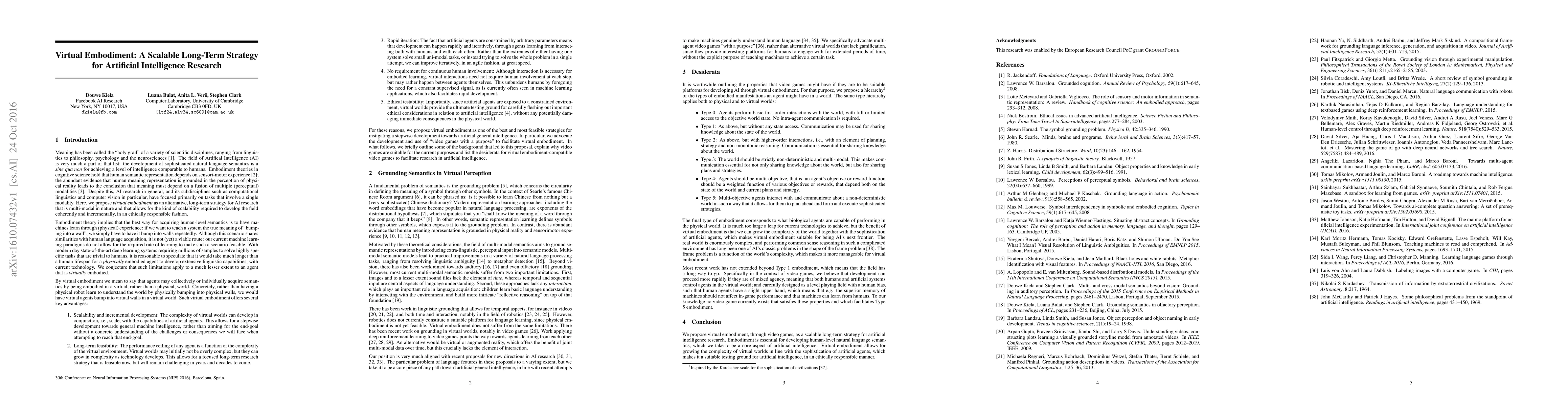 Meaning has been called the "holy grail" of a variety of scientific disciplines, ranging from linguistics to philosophy, psychology and the neurosciences. The field of Artifical Intelligence (AI) is very much a part of that list: the development of sophisticated natural language semantics is a sine qua non for achieving a level of intelligence comparable to humans. Embodiment theories in cognitive science hold that human semantic representation depends on sensori-motor experience; the abundant evidence that human meaning representation is grounded in the perception of physical reality leads to the conclusion that meaning must depend on a fusion of multiple (perceptual) modalities. Despite this, AI research in general, and its subdisciplines such as computational linguistics and computer vision in particular, have focused primarily on tasks that involve a single modality. Here, we propose virtual embodiment as an alternative, long-term strategy for AI research that is multi-modal in nature and that allows for the kind of scalability required to develop the field coherently and incrementally, in an ethically responsible fashion.