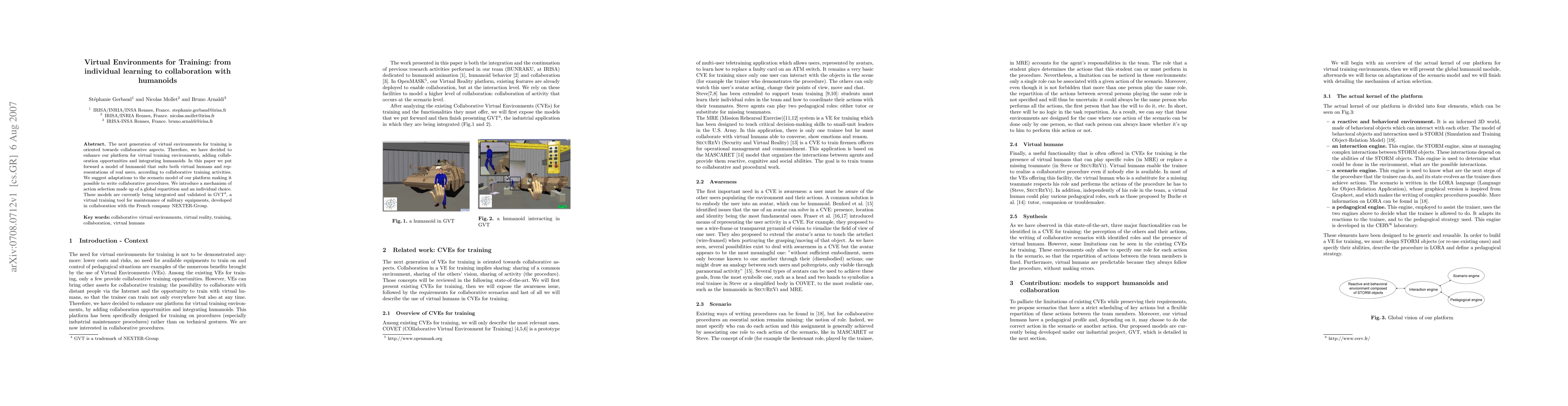 The next generation of virtual environments for training is oriented towards collaborative aspects. Therefore, we have decided to enhance our platform for virtual training environments, adding collaboration opportunities and integrating humanoids. In this paper we put forward a model of humanoid that suits both virtual humans and representations of real users, according to collaborative training activities. We suggest adaptations to the scenario model of our platform making it possible to write collaborative procedures. We introduce a mechanism of action selection made up of a global repartition and an individual choice. These models are currently being integrated and validated in GVT, a virtual training tool for maintenance of military equipments, developed in collaboration with the French company NEXTER-Group.