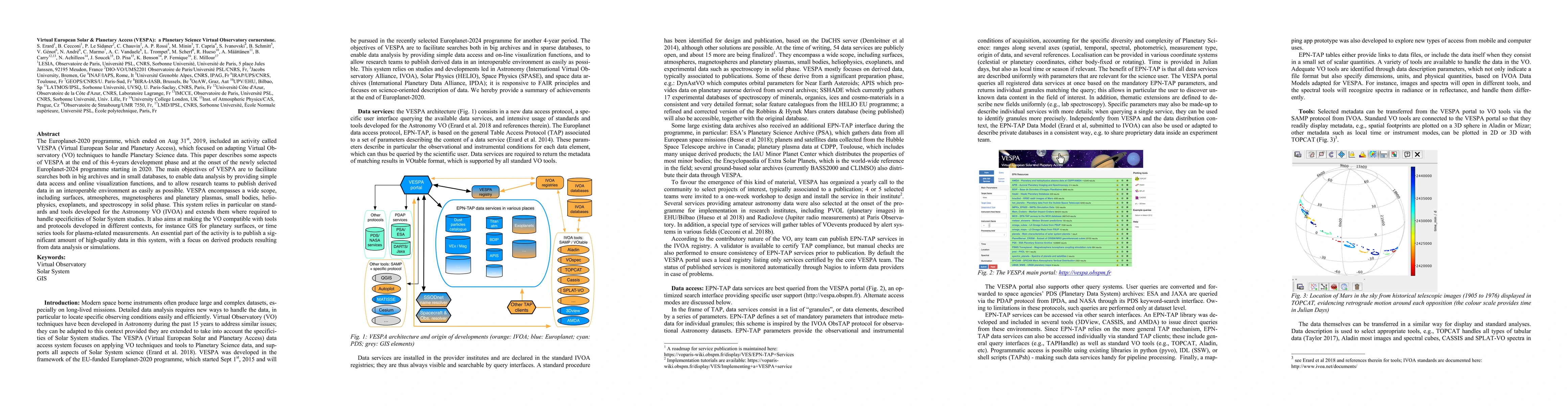 The VESPA project, part of the Europlanet-2020 programme, adapts Virtual Observatory techniques for planetary science data, aiming to facilitate data searches, analysis, and publication in an interoperable environment. It extends astronomy VO standards to cover Solar System studies and aims to integrate diverse planetary science tools and protocols.