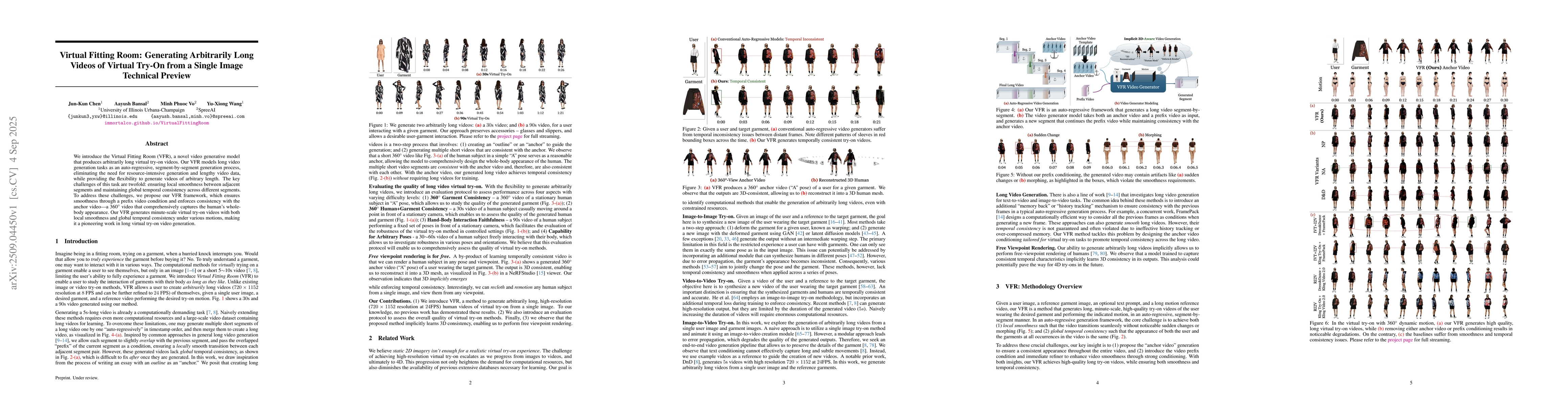 We introduce the Virtual Fitting Room (VFR), a novel video generative model that produces arbitrarily long virtual try-on videos. Our VFR models long video generation tasks as an auto-regressive, segment-by-segment generation process, eliminating the need for resource-intensive generation and lengthy video data, while providing the flexibility to generate videos of arbitrary length. The key challenges of this task are twofold: ensuring local smoothness between adjacent segments and maintaining global temporal consistency across different segments. To address these challenges, we propose our VFR framework, which ensures smoothness through a prefix video condition and enforces consistency with the anchor video -- a 360-degree video that comprehensively captures the human's wholebody appearance. Our VFR generates minute-scale virtual try-on videos with both local smoothness and global temporal consistency under various motions, making it a pioneering work in long virtual try-on video generation.