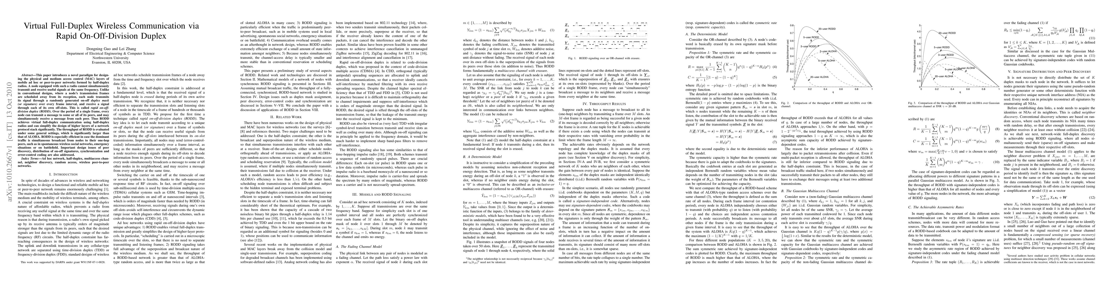 This paper introduces a novel paradigm for design- ing the physical and medium access control (MAC) layers of mobile ad hoc or peer-to-peer networks formed by half-duplex radios. A node equipped with such a radio cannot simultaneously transmit and receive useful signals at the same frequency. Unlike in conventional designs, where a node's transmission frames are scheduled away from its reception, each node transmits its signal through a randomly generated on-off duplex mask (or signature) over every frame interval, and receive a signal through each of its own off-slots. This is called rapid on-off- division duplex (RODD). Over the period of a single frame, every node can transmit a message to some or all of its peers, and may simultaneously receive a message from each peer. Thus RODD achieves virtual full-duplex communication using half-duplex radios and can simplify the design of higher layers of a network protocol stack significantly. The throughput of RODD is evaluated under some general settings, which is significantly larger than that of ALOHA. RODD is especially efficient in case the dominant traffic is simultaneous broadcast from nodes to their one-hop peers, such as in spontaneous wireless social networks, emergency situations or on battlefield. Important design issues of peer discovery, distribution of on-off signatures, synchronization and error-control coding are also addressed.