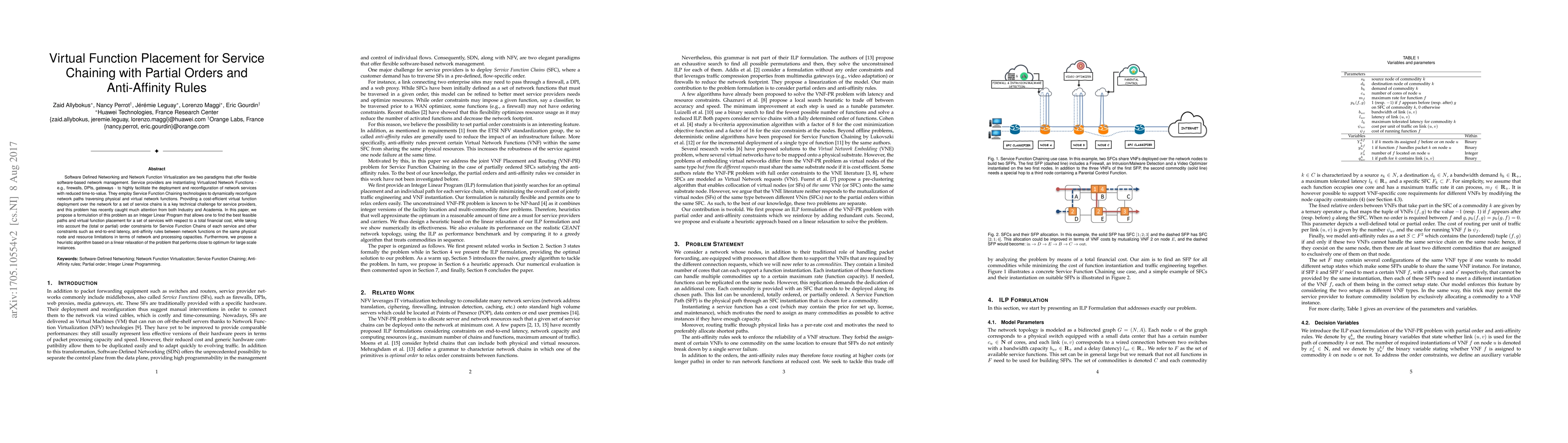 This paper proposes an Integer Linear Program to optimize the placement of virtual network functions in service chains, considering cost, order constraints, latency, anti-affinity rules, and resource limitations. It also introduces a heuristic algorithm for scalable solutions.