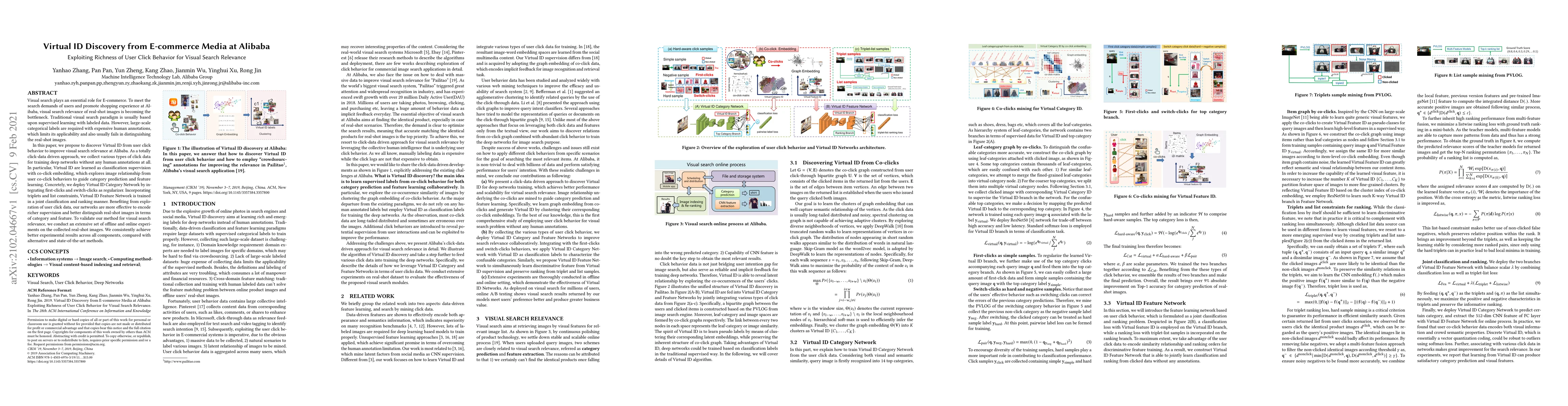 This paper proposes a click-data driven approach to enhance visual search relevance at Alibaba by discovering Virtual ID from user click behavior, eliminating the need for manual annotations. The method leverages co-click embedding and integrates first-clicks and switch-clicks to improve category prediction and feature learning, achieving better results in distinguishing real-shot images.