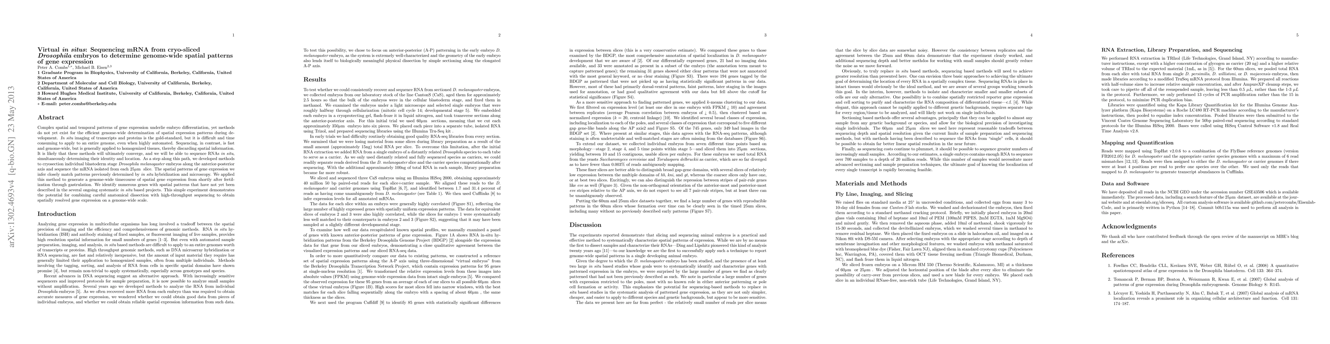 This paper develops a method to cryosection Drosophila embryos and sequence mRNA from each slice to determine genome-wide spatial patterns of gene expression, demonstrating its potential for high-throughput, spatially resolved transcriptomics. The method reveals novel spatial gene expression patterns, bridging the gap between in situ imaging and sequencing.
