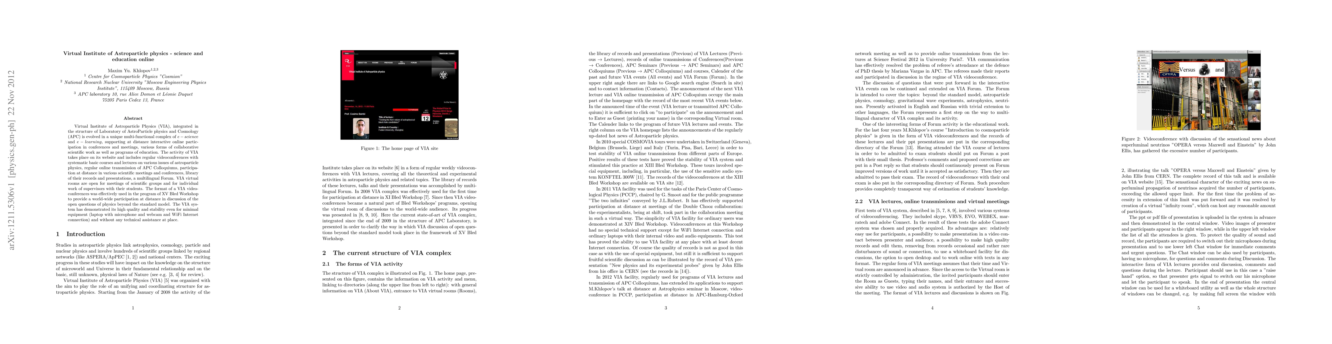 The Virtual Institute of Astroparticle Physics (VIA) offers a comprehensive online platform for e-science and e-learning, facilitating remote participation in conferences and collaborative scientific work, along with educational programs. VIA's stable and high-quality system, requiring minimal equipment, effectively supports global participation in advanced physics discussions.