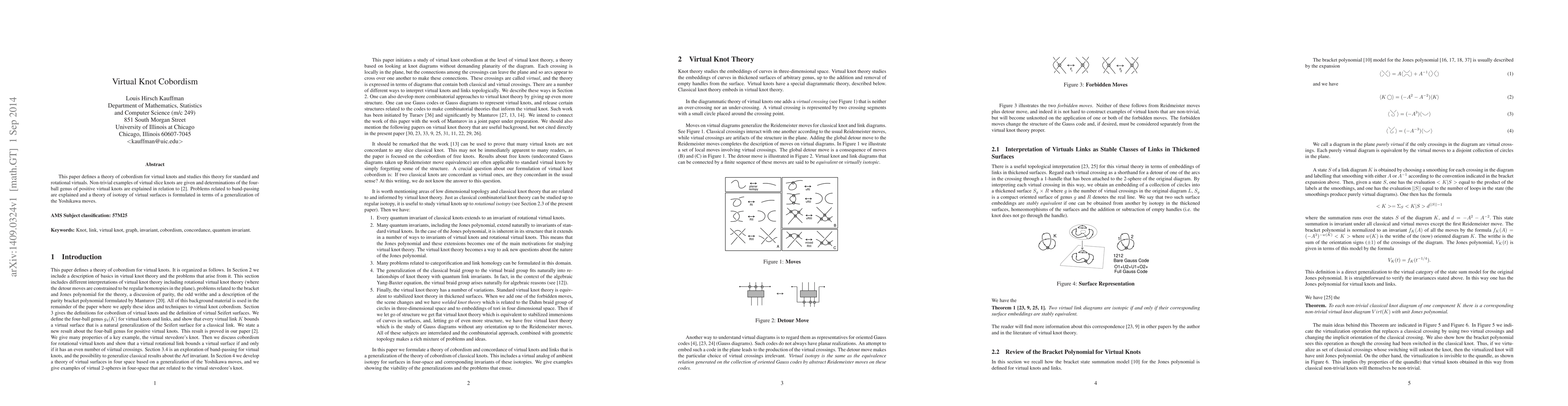 This paper defines a theory of cobordism for virtual knots and studies this theory for standard and rotational virtual knots and links. Non-trivial examples of virtual slice knots are given. Determinations of the four-ball genus of positive virtual knots are given using the results of a companion paper by the author and Heather Dye and Aaron Kaestner. Problems related to band-passing are explained, and a theory of isotopy of virtual surfaces is formulated in terms of a generalization of the Yoshikawa moves.