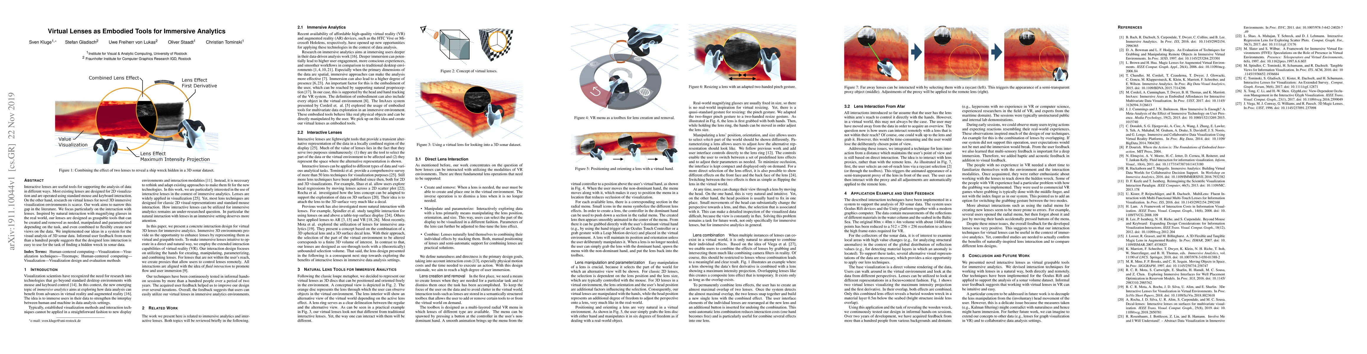 Interactive lenses are useful tools for supporting the analysis of data in different ways. Most existing lenses are designed for 2D visualization and are operated using standard mouse and keyboard interaction. On the other hand, research on virtual lenses for novel 3D immersive visualization environments is scarce. Our work aims to narrow this gap in the literature. We focus particularly on the interaction with lenses. Inspired by natural interaction with magnifying glasses in the real world, our lenses are designed as graspable tools that can be created and removed as needed, manipulated and parameterized depending on the task, and even combined to flexibly create new views on the data. We implemented our ideas in a system for the visual analysis of 3D sonar data. Informal user feedback from more than a hundred people suggests that the designed lens interaction is easy to use for the task of finding a hidden wreck in sonar data.