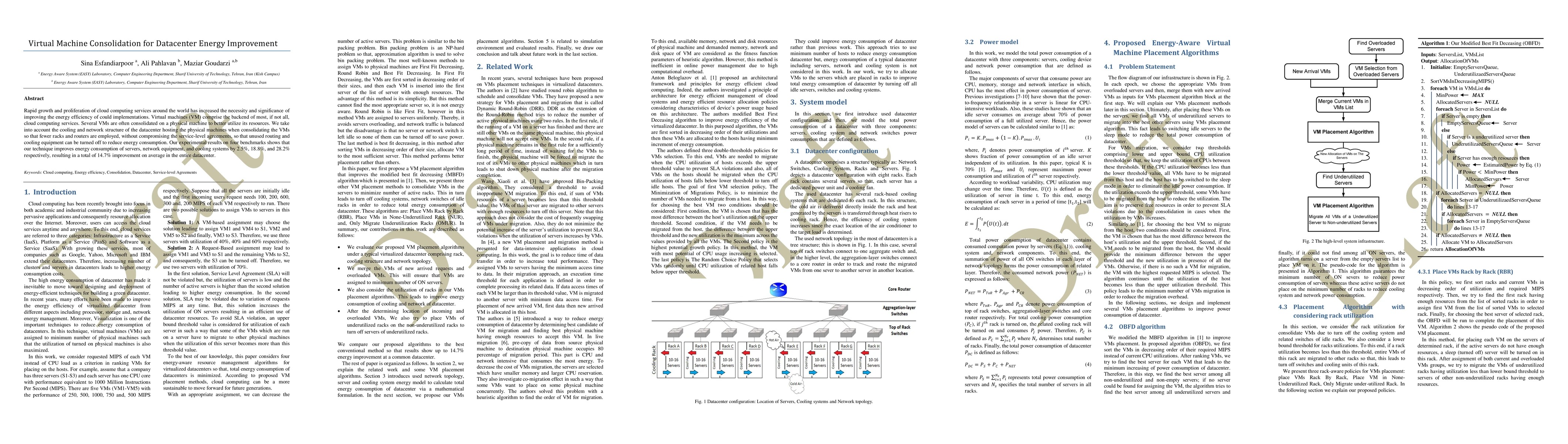 This paper proposes a method for consolidating virtual machines to improve datacenter energy efficiency by optimizing resource utilization and reducing the use of cooling and network equipment. Experimental results show a 14.7% average energy consumption reduction across servers, network, and cooling systems.