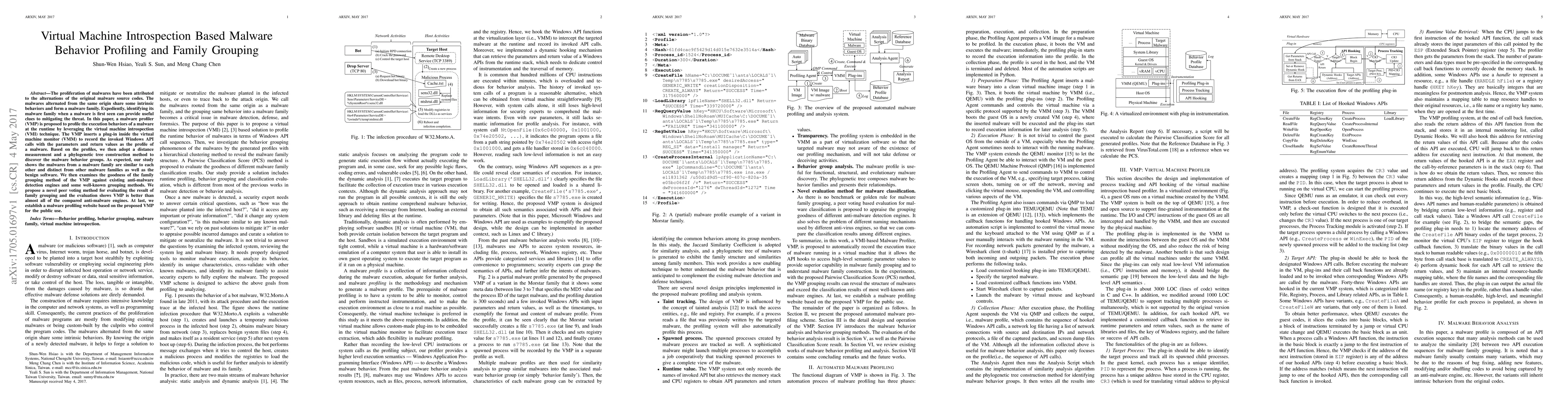 This paper proposes a Virtual Machine Introspection-based Malware Profiler (VMP) to analyze malware behavior by recording API calls, and uses Jaccard distance and phylogenetic trees to group malware into families. The VMP outperforms existing anti-malware detection engines and is compatible with text-mining and high-order N-gram approaches.