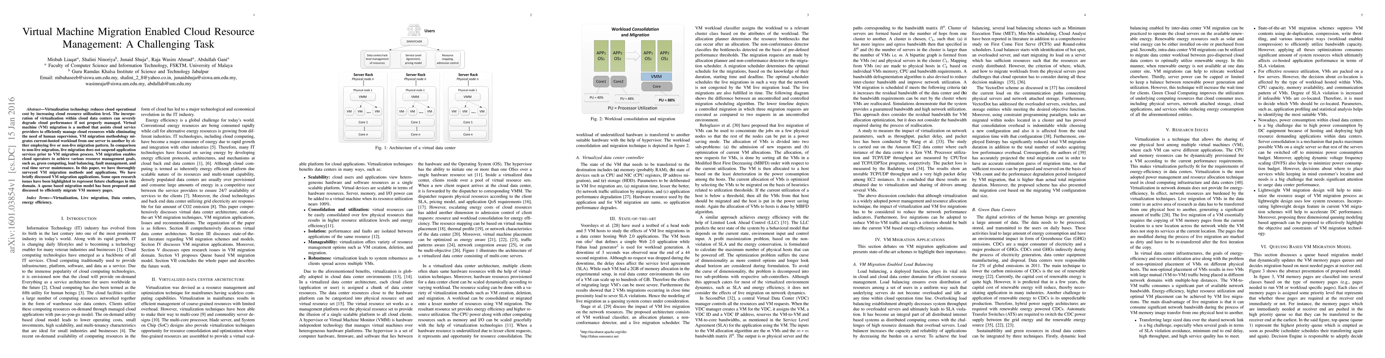 Virtualization technology reduces cloud operational cost by increasing cloud resource utilization level. The incorporation of virtualization within cloud data centers can severely degrade cloud performance if not properly managed. Virtual machine (VM) migration is a method that assists cloud service providers to efficiently manage cloud resources while eliminating the need of human supervision. VM migration methodology migrates current-hosted workload from one server to another by either employing live or non-live migration pattern. In comparison to non-live migration, live migration does not suspend application services prior to VM migration process. VM migration enables cloud operators to achieve various resource management goals, such as, green computing, load balancing, fault management, and real time server maintenance. In this paper, we have thoroughly surveyed VM migration methods and applications. We have briefly discussed VM migration applications. Some open research issues have been highlighted to represent future challenges in this domain. A queue based migration model has been proposed and discussed to efficiently migrate VM memory pages.