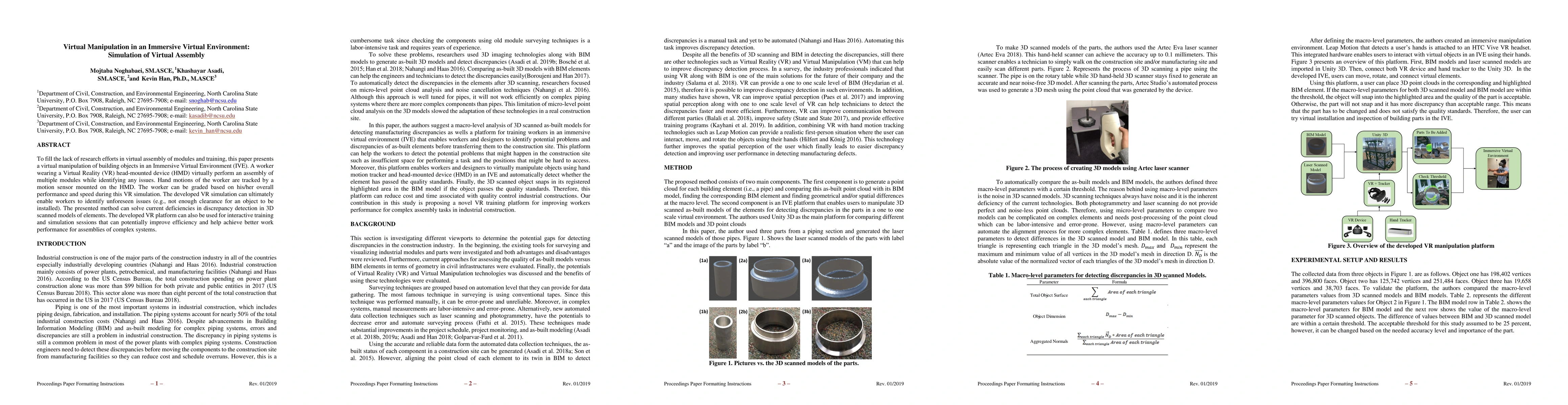 To fill the lack of research efforts in virtual assembly of modules and training, this paper presents a virtual manipulation of building objects in an Immersive Virtual Environment (IVE). A worker wearing a Virtual Reality (VR) head-mounted device (HMD) virtually perform an assembly of multiple modules while identifying any issues. Hand motions of the worker are tracked by a motion sensor mounted on the HMD. The worker can be graded based on his/her overall performance and speed during this VR simulation. The developed VR simulation can ultimately enable workers to identify unforeseen issues (e.g., not enough clearance for an object to be installed). The presented method can solve current deficiencies in discrepancy detection in 3D scanned models of elements. The developed VR platform can also be used for interactive training and simulation sessions that can potentially improve efficiency and help achieve better work performance for assemblies of complex systems.